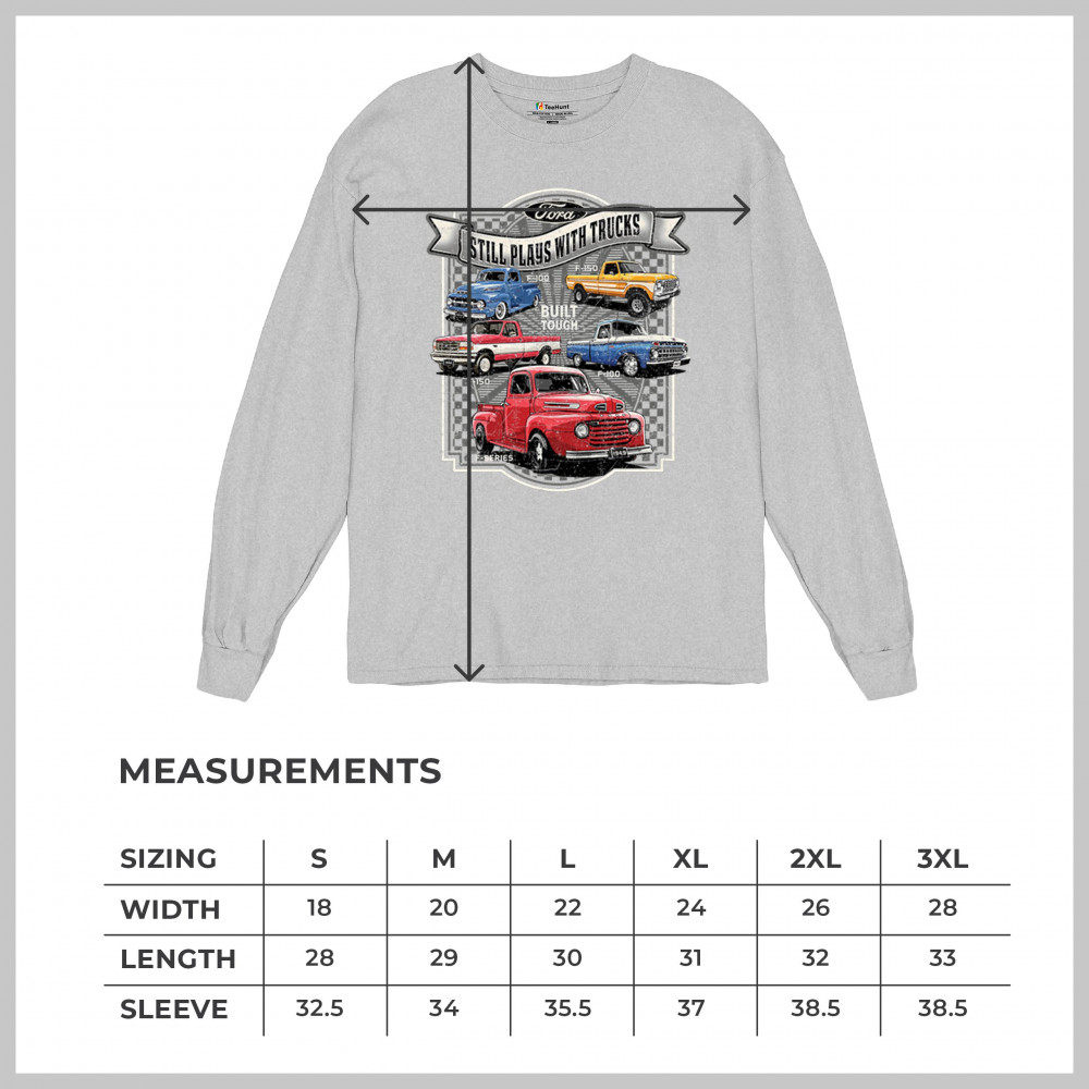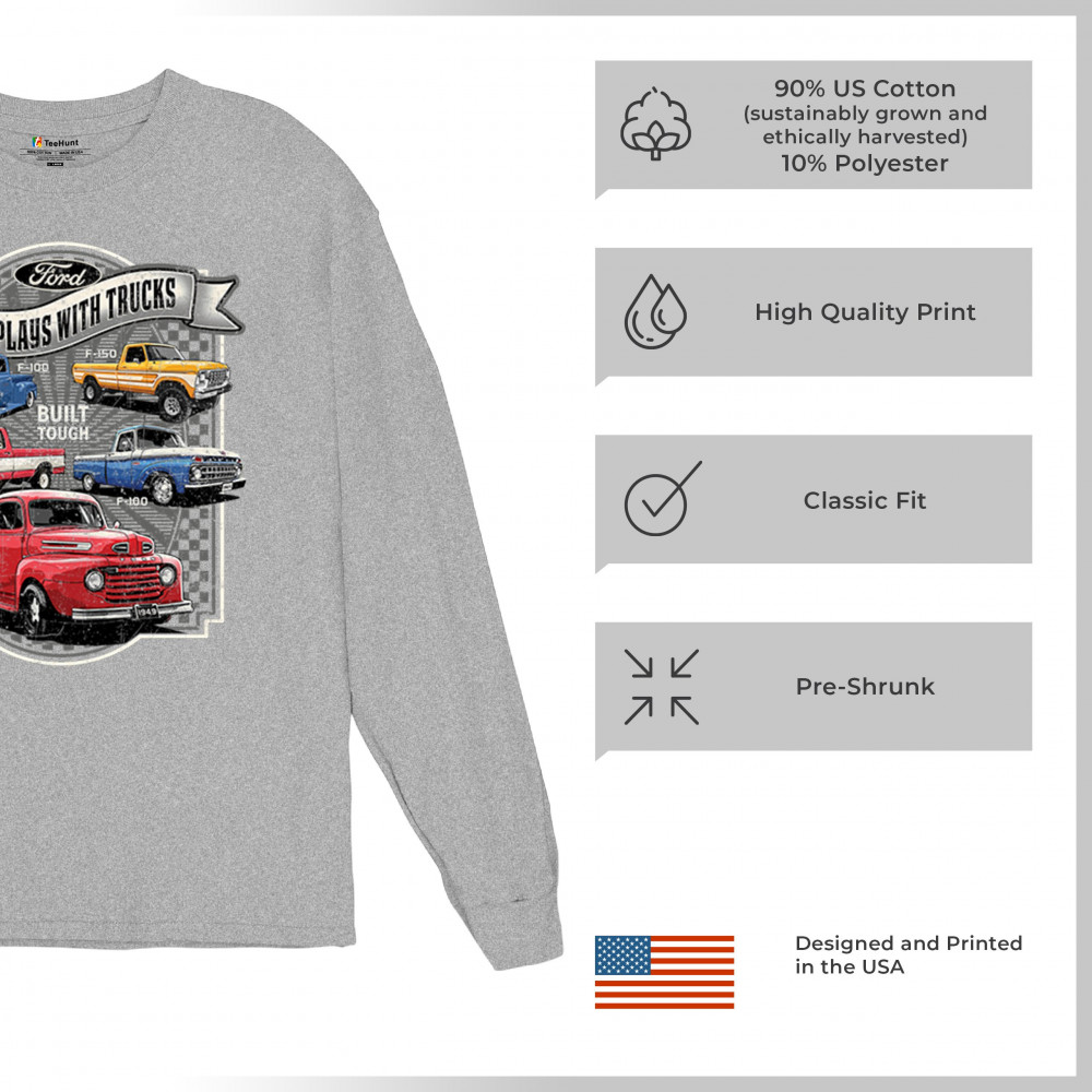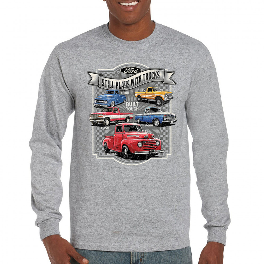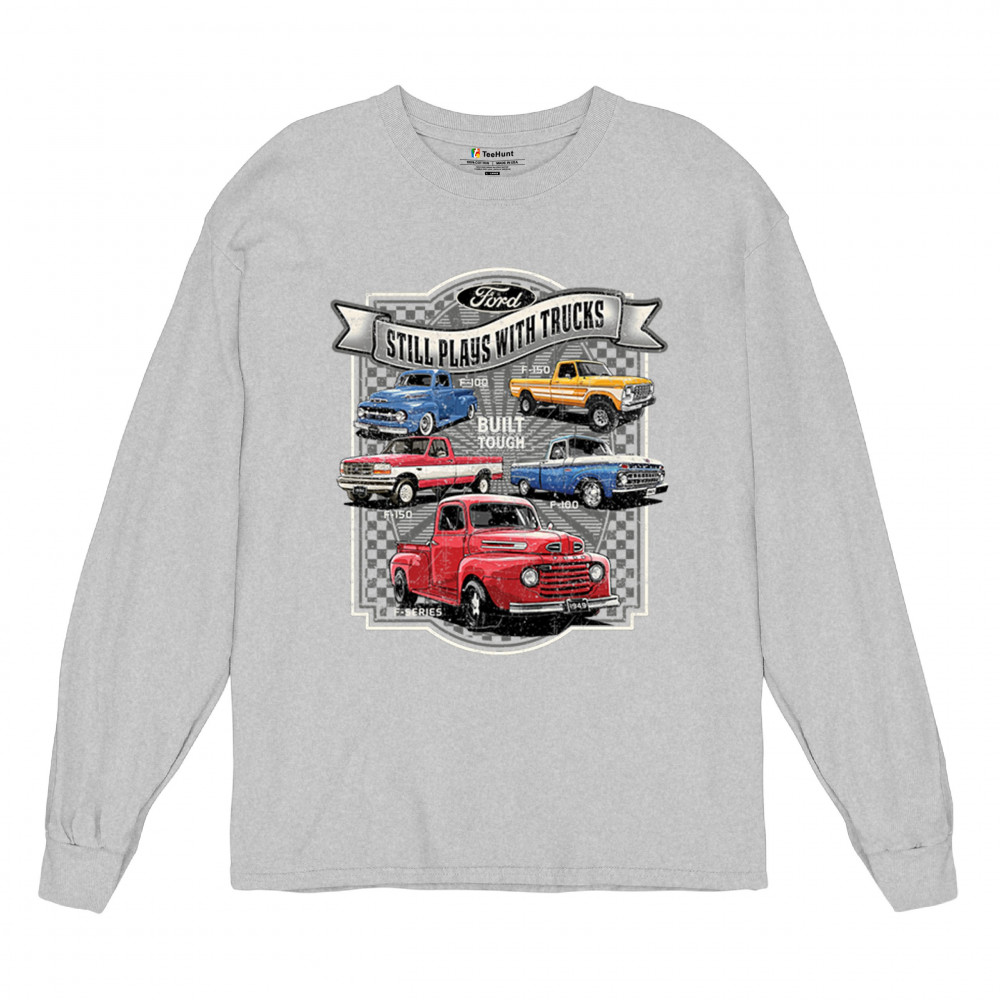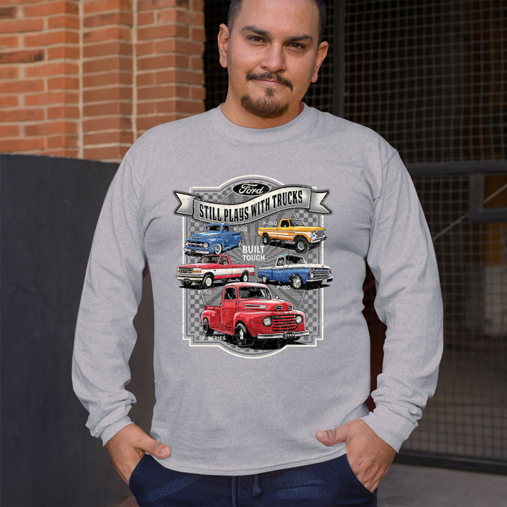 Features classic Ford F-Series trucks from 1949 to F-150. Great for vintage truck fans, garage wear, car shows, and collectors who love pickups.