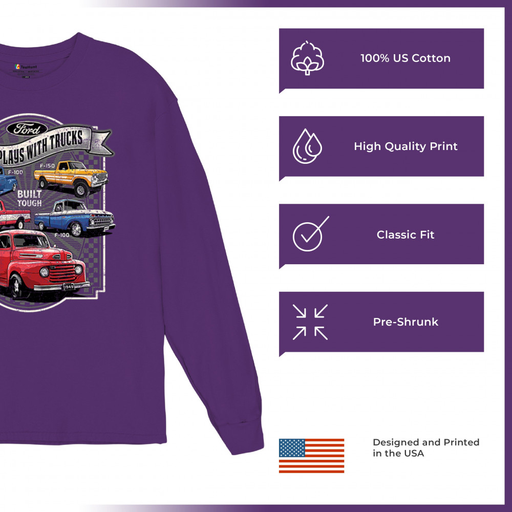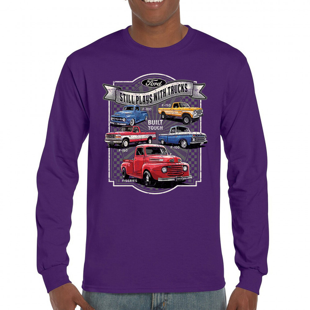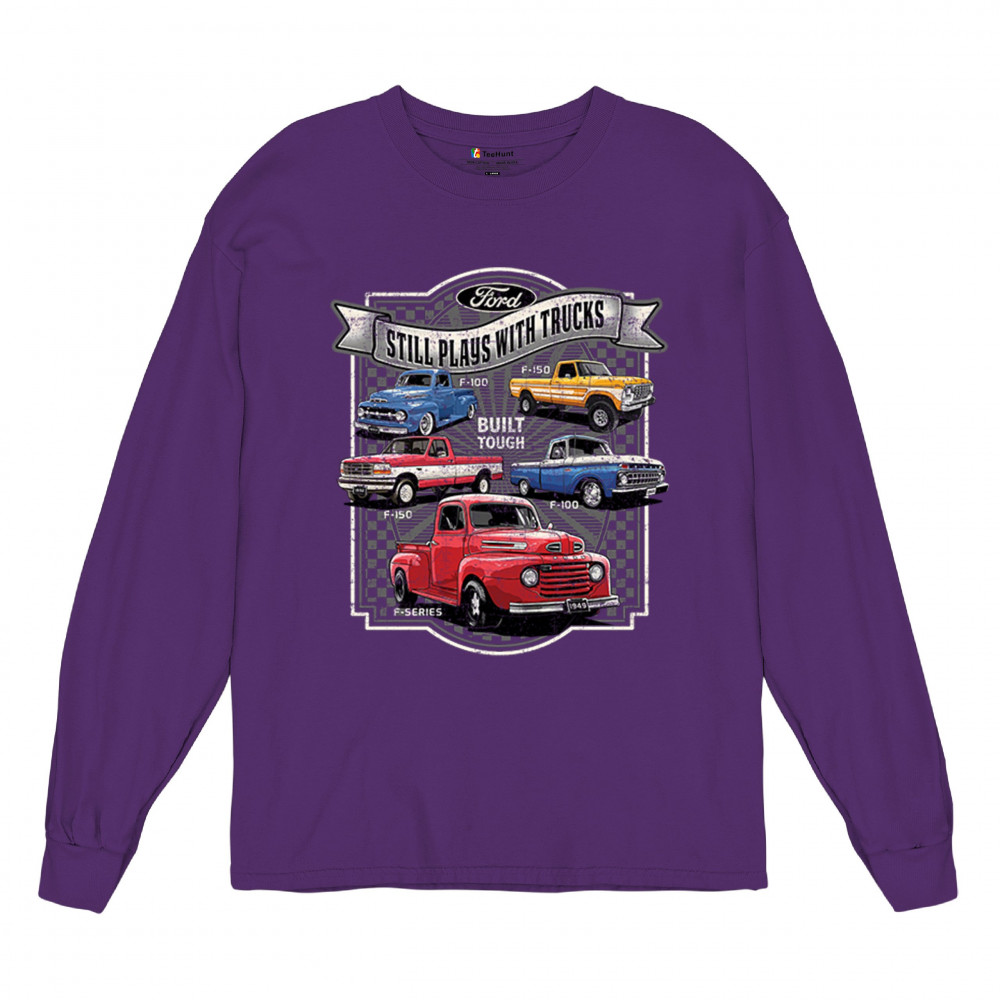 Features classic Ford F-Series trucks from 1949 to F-150. Great for vintage truck fans, garage wear, car shows, and collectors who love pickups.