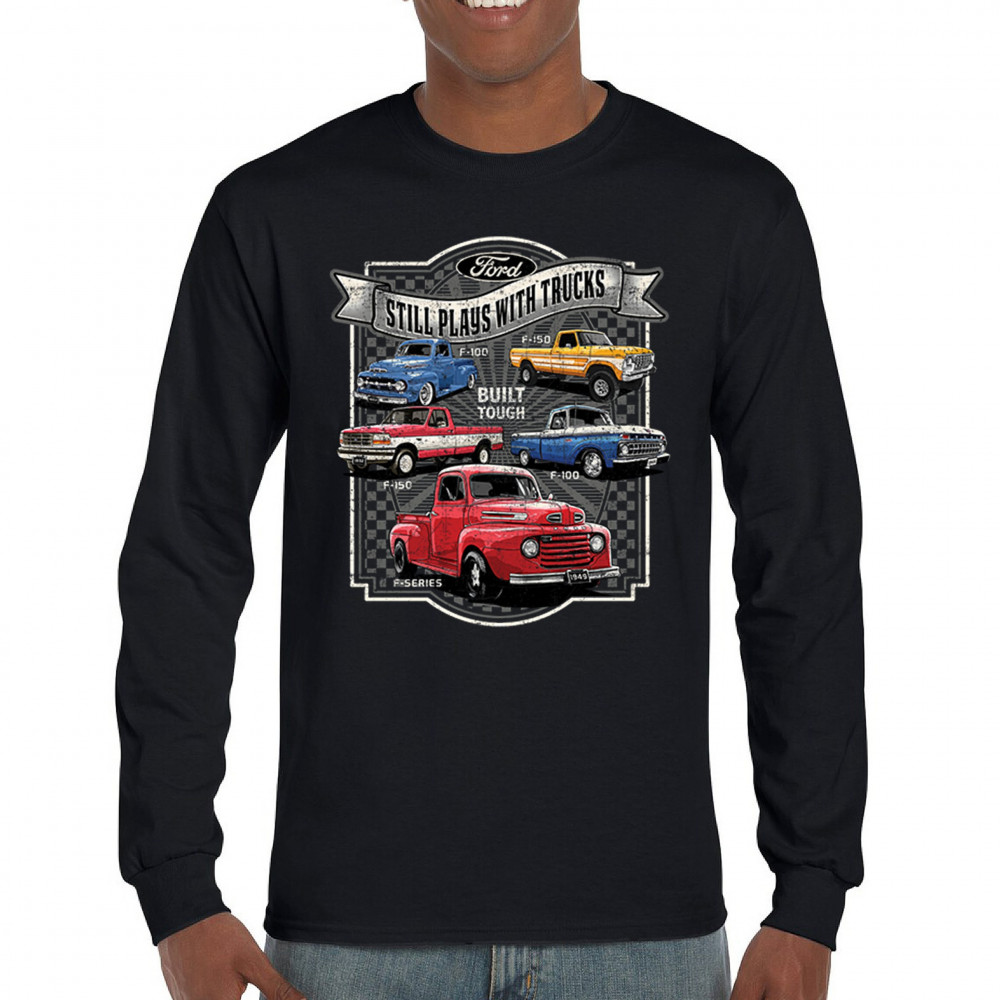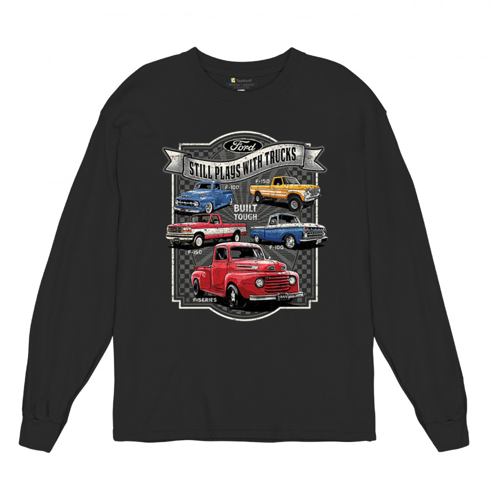Features classic Ford F-Series trucks from 1949 to F-150. Great for vintage truck fans, garage wear, car shows, and collectors who love pickups.