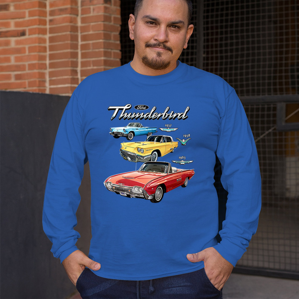Iconic Ford Thunderbird design with 1957, 1958, and 1963 models. A vintage tribute for car collectors and American muscle fans.