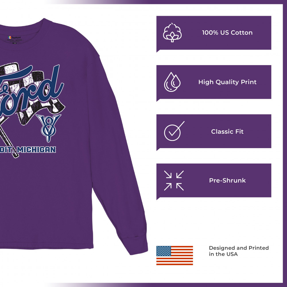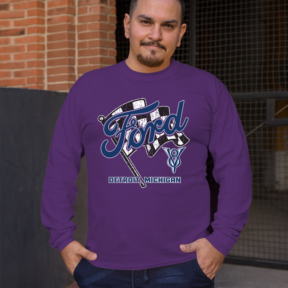 Honor Detroit, Michigan’s Ford legacy with this officially licensed design featuring a checkered flag and bold V8 emblem, perfect for muscle car fans and classic car lovers.