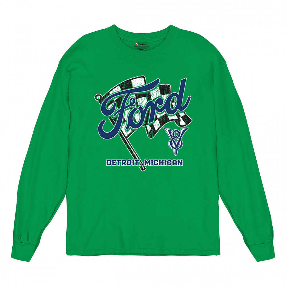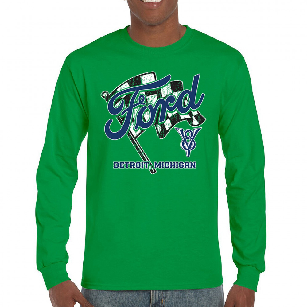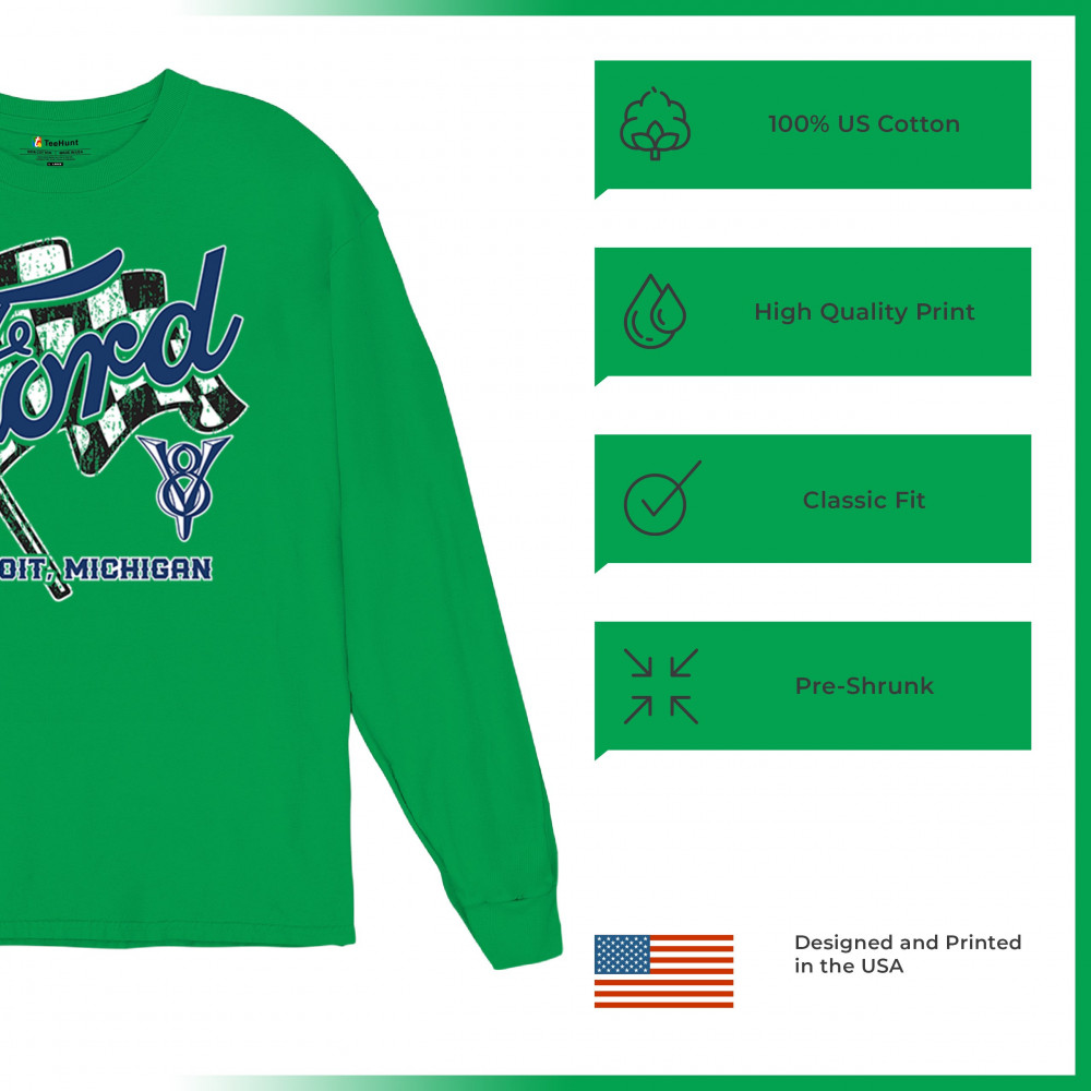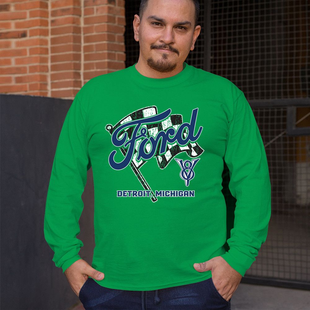 Honor Detroit, Michigan’s Ford legacy with this officially licensed design featuring a checkered flag and bold V8 emblem, perfect for muscle car fans and classic car lovers.