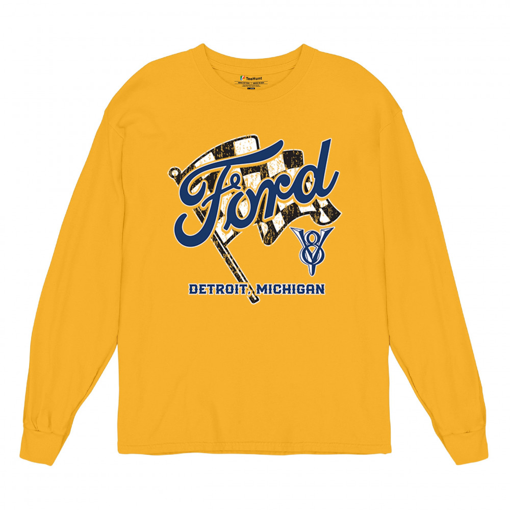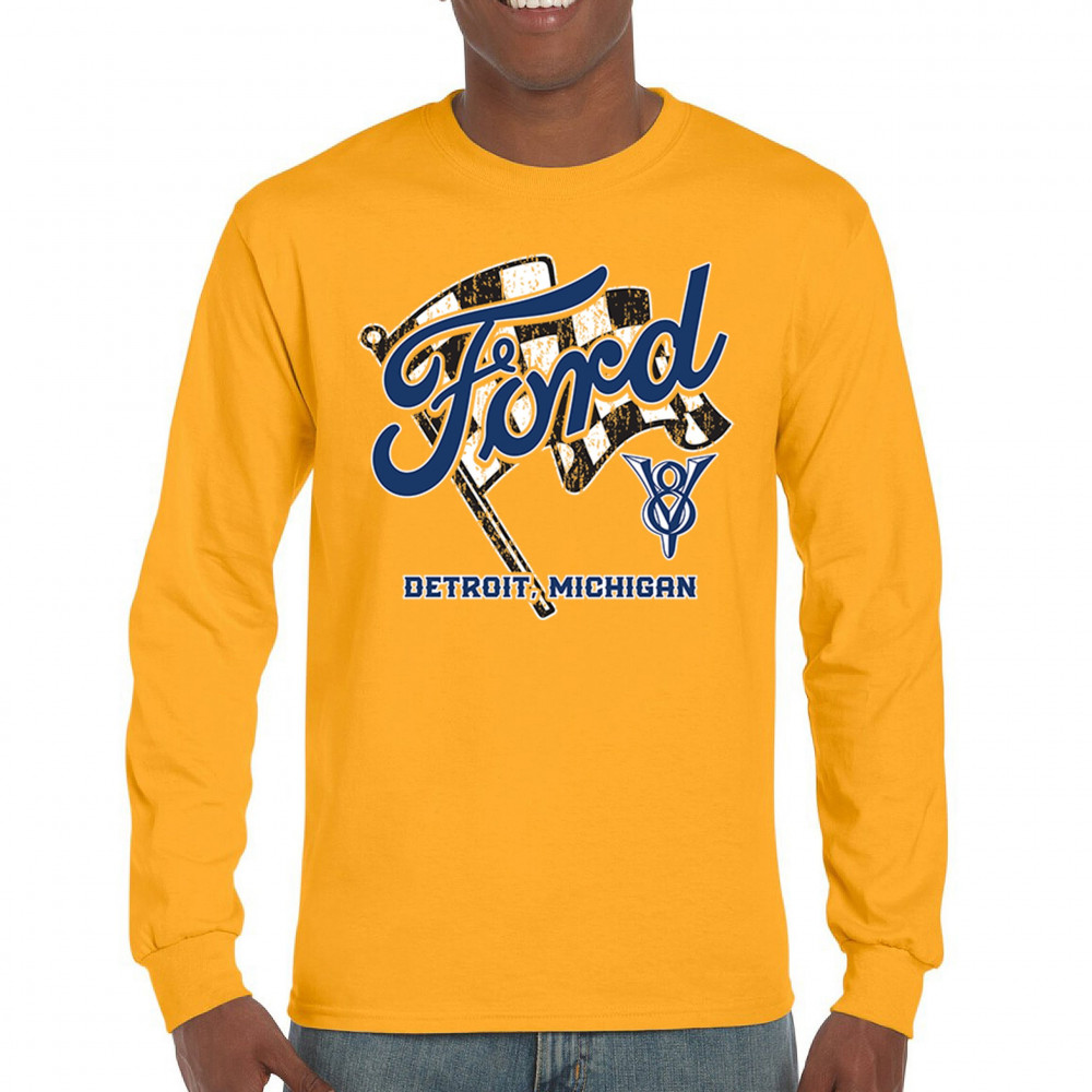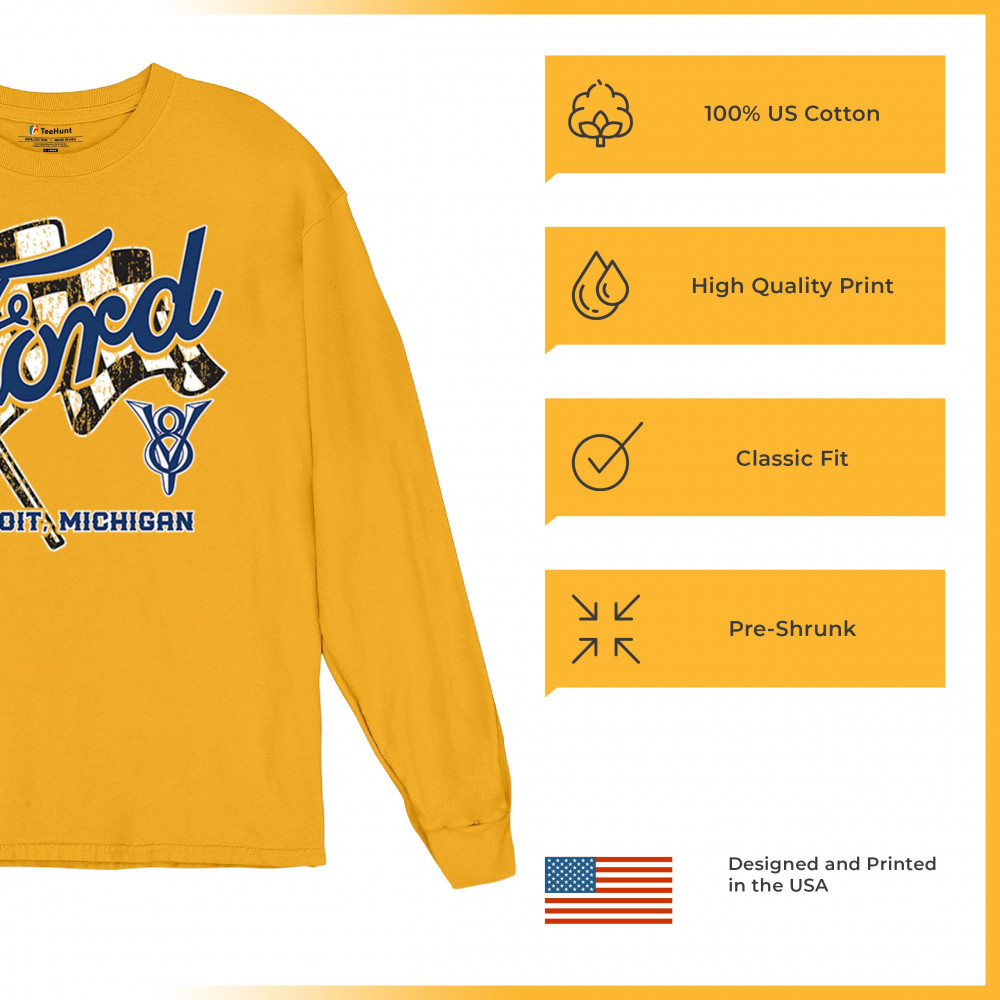 Honor Detroit, Michigan’s Ford legacy with this officially licensed design featuring a checkered flag and bold V8 emblem, perfect for muscle car fans and classic car lovers.