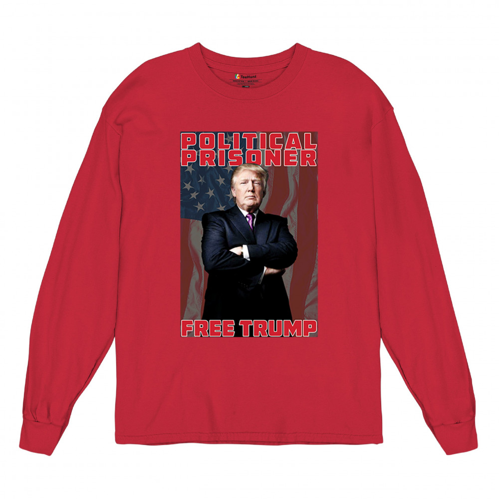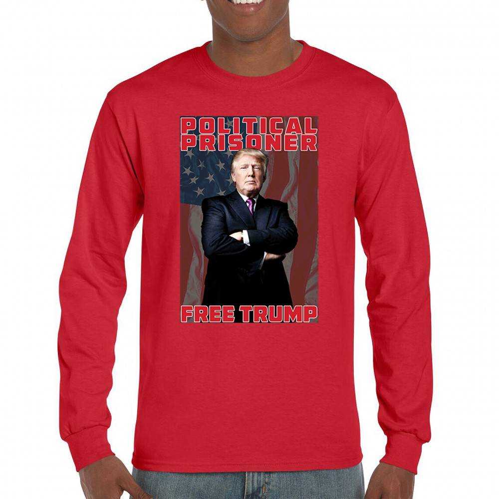 Show your support with the "Political Prisoner Free Trump" design, featuring Trump against an American flag. Perfect for conservative patriots and Trump supporters.