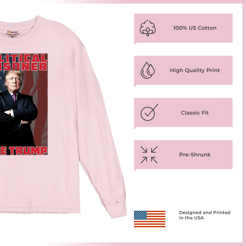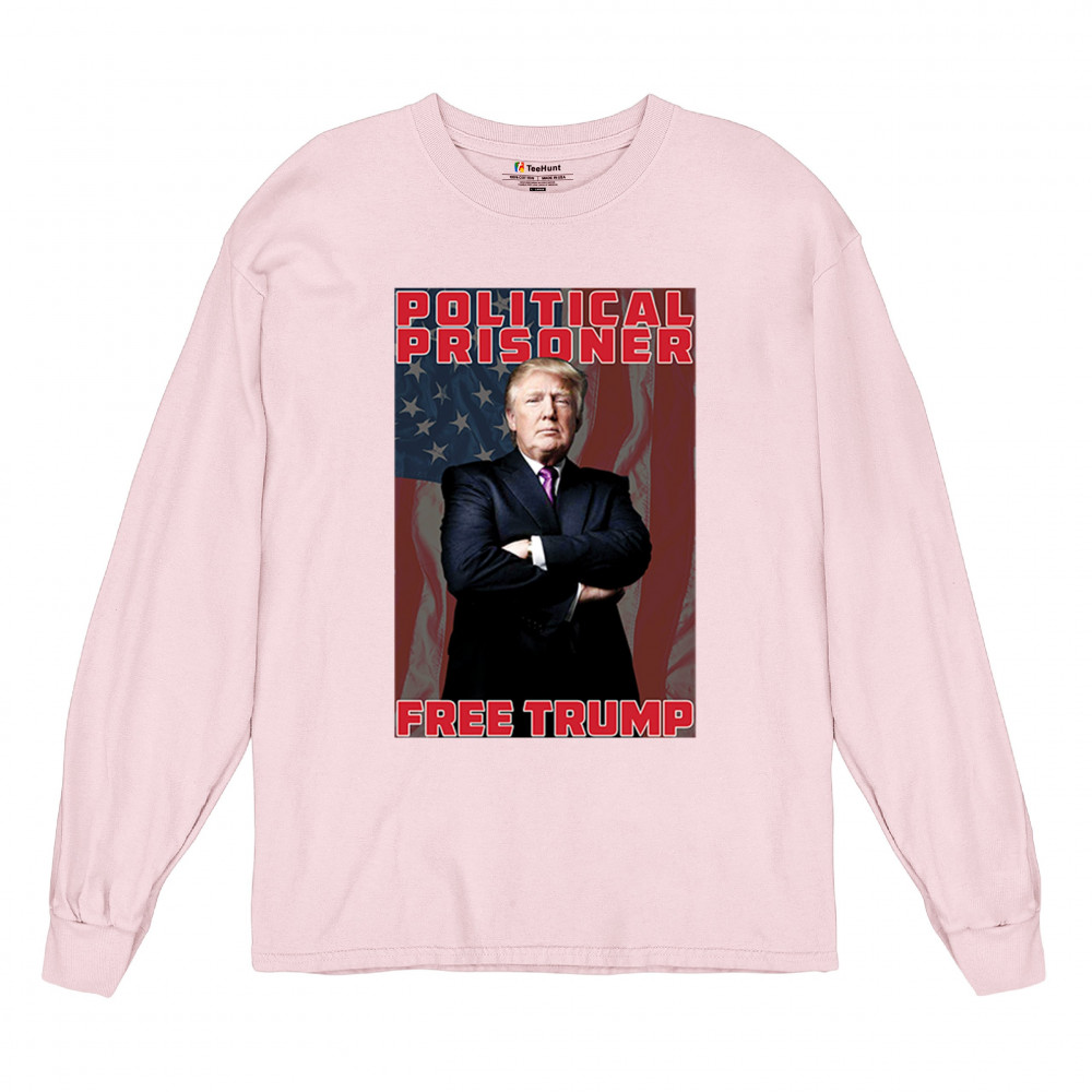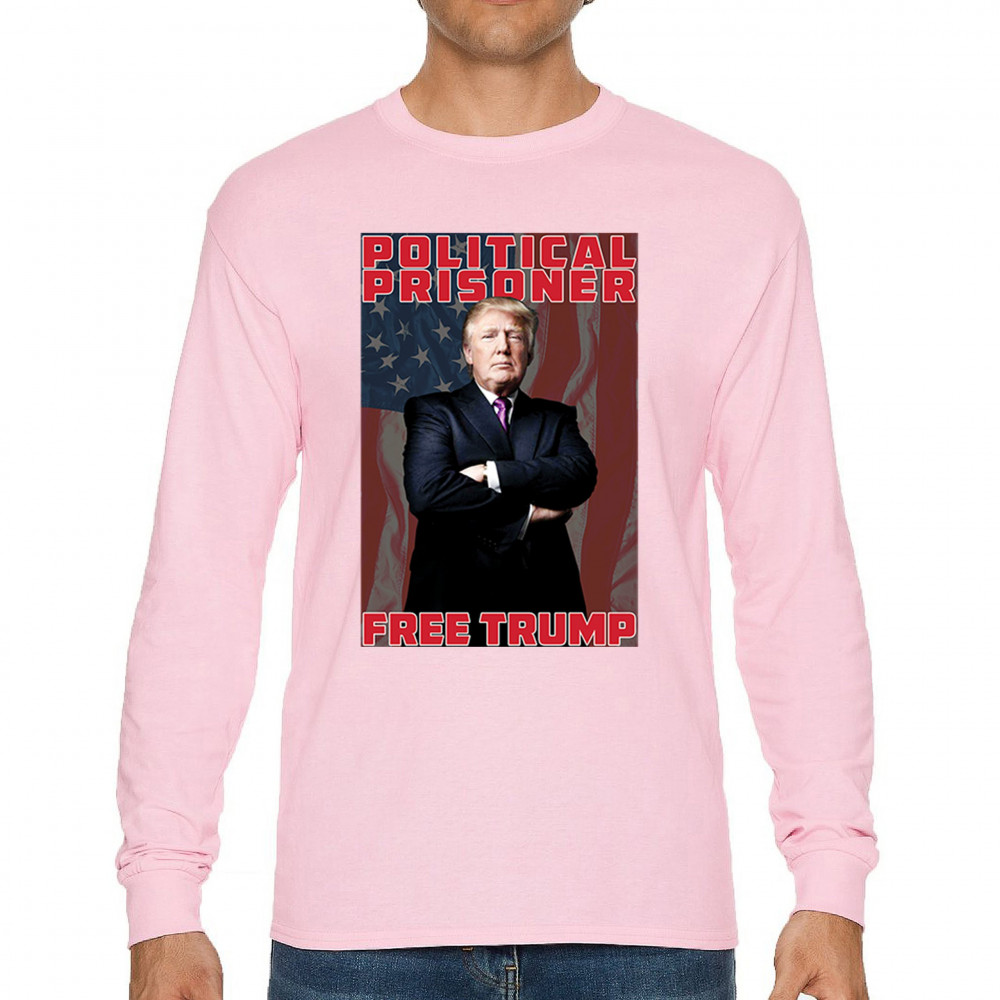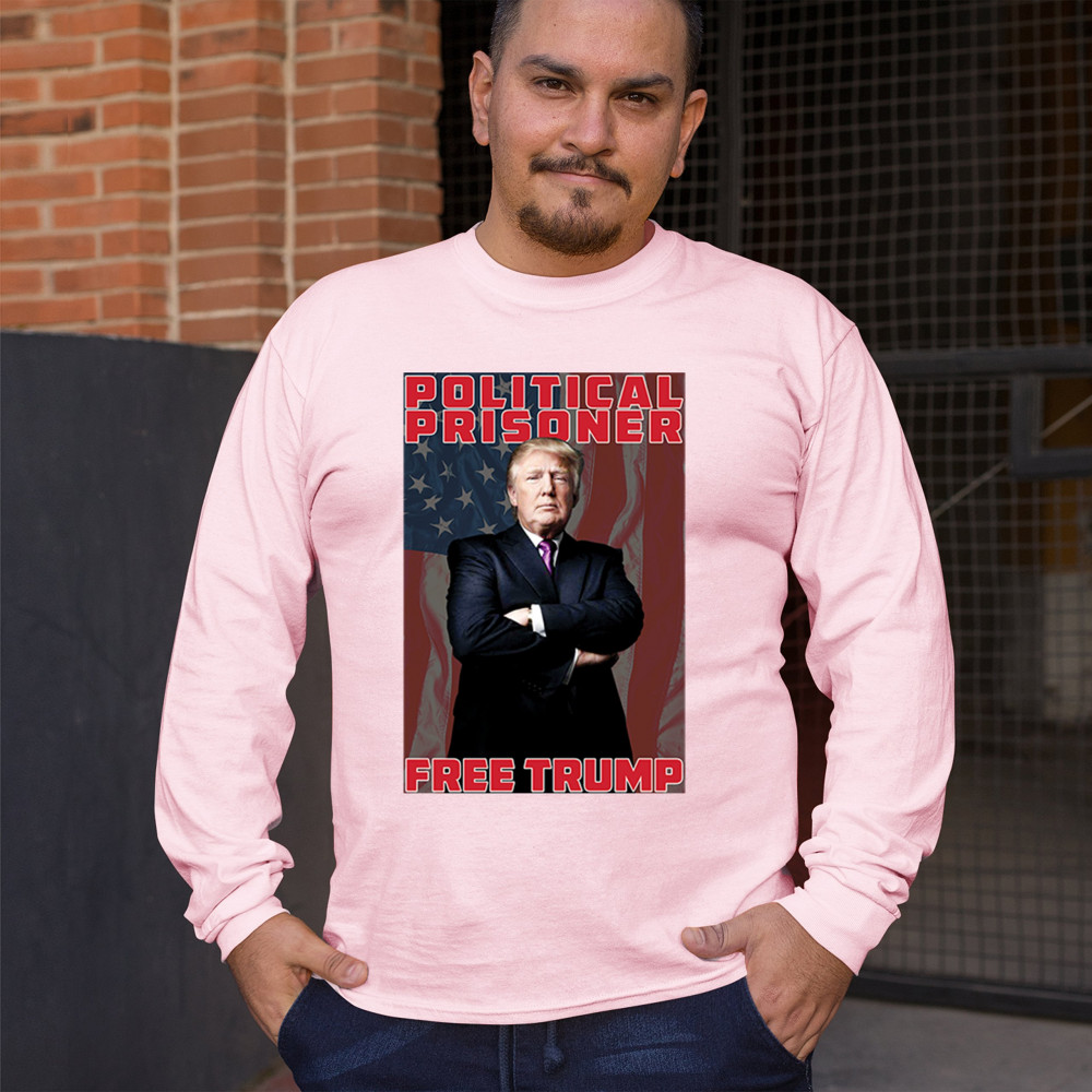 Show your support with the "Political Prisoner Free Trump" design, featuring Trump against an American flag. Perfect for conservative patriots and Trump supporters.
