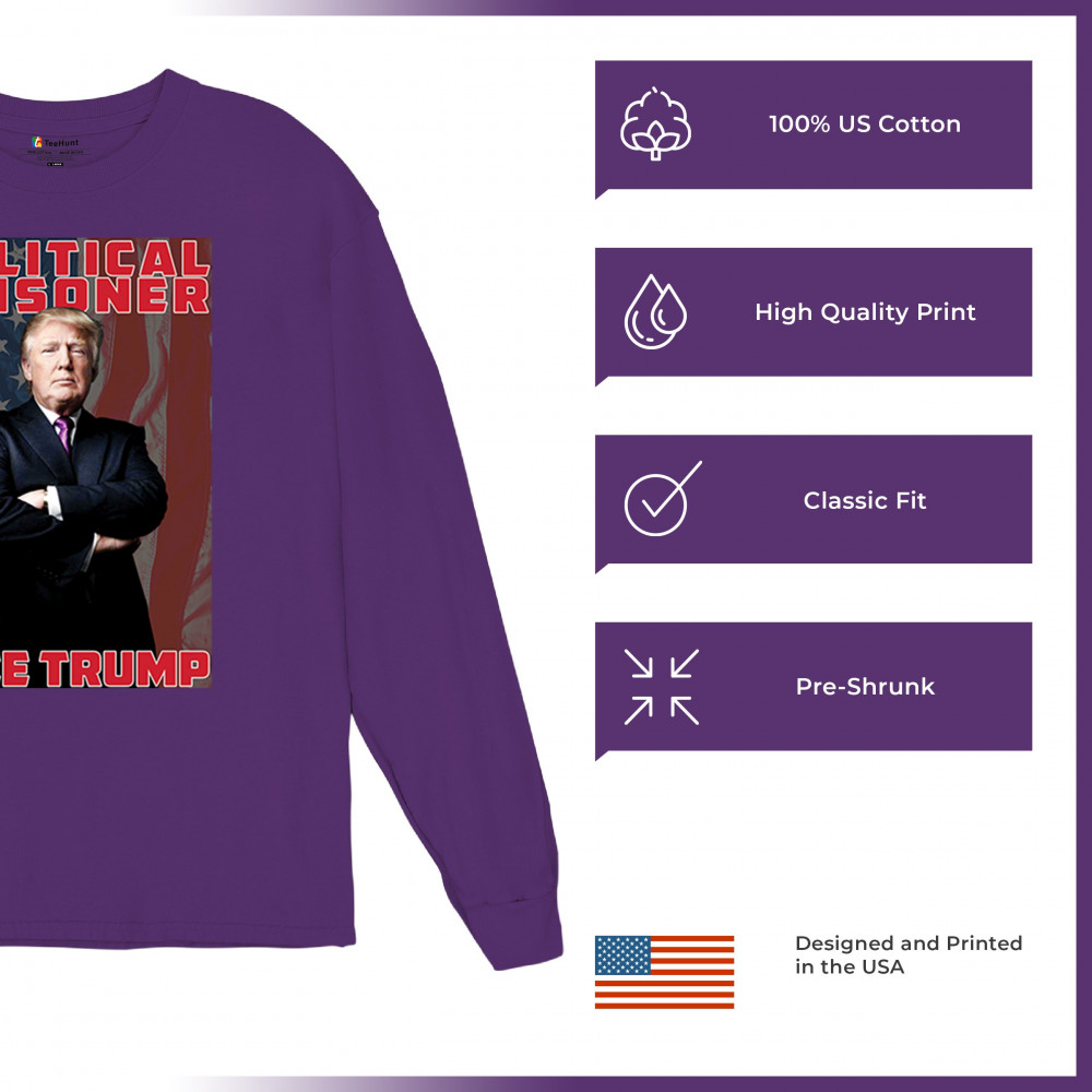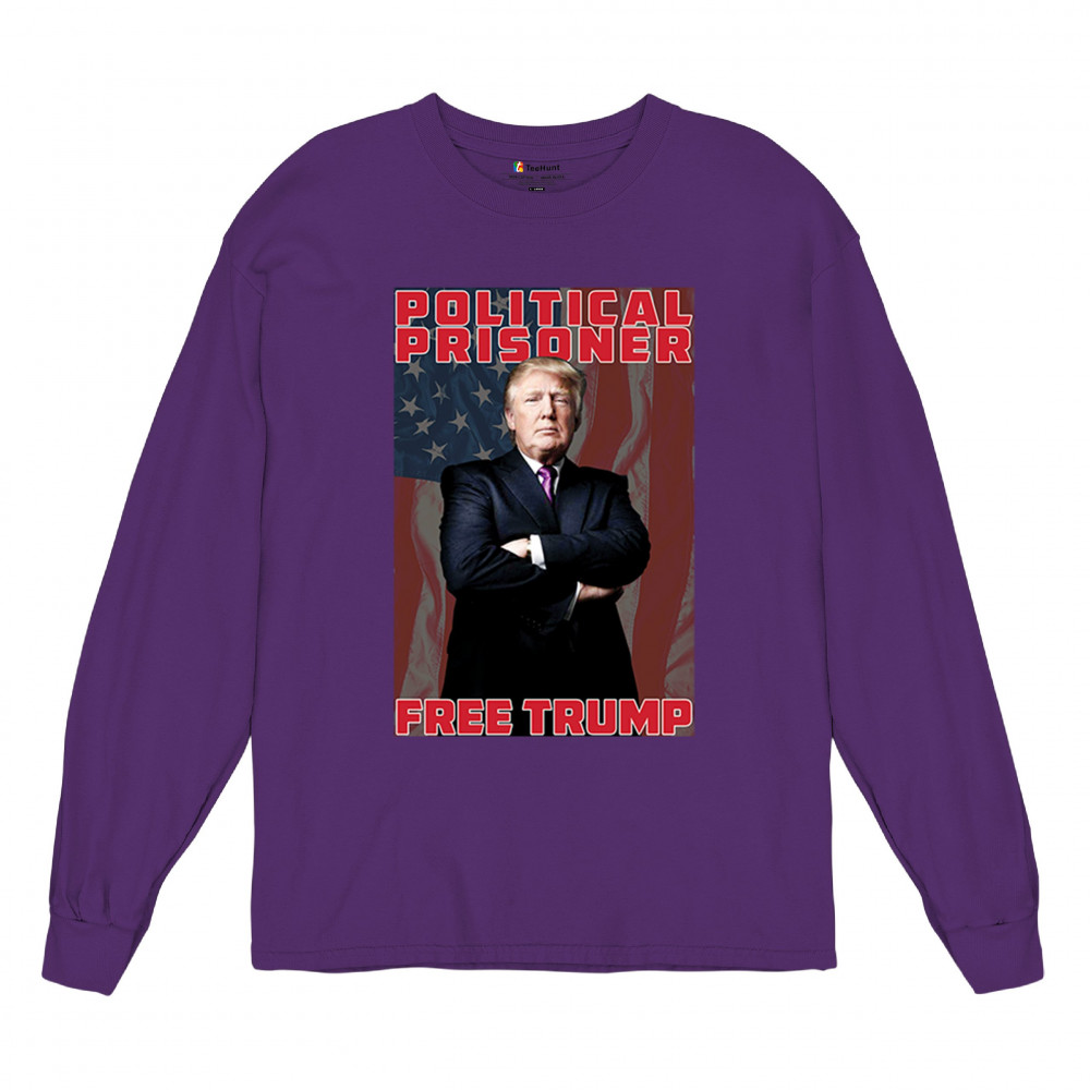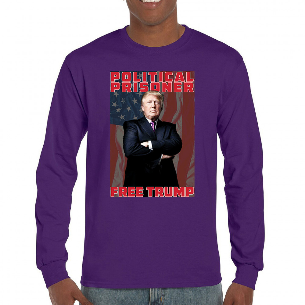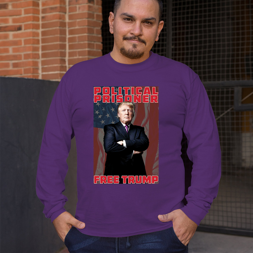 Show your support with the "Political Prisoner Free Trump" design, featuring Trump against an American flag. Perfect for conservative patriots and Trump supporters.