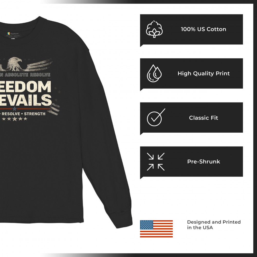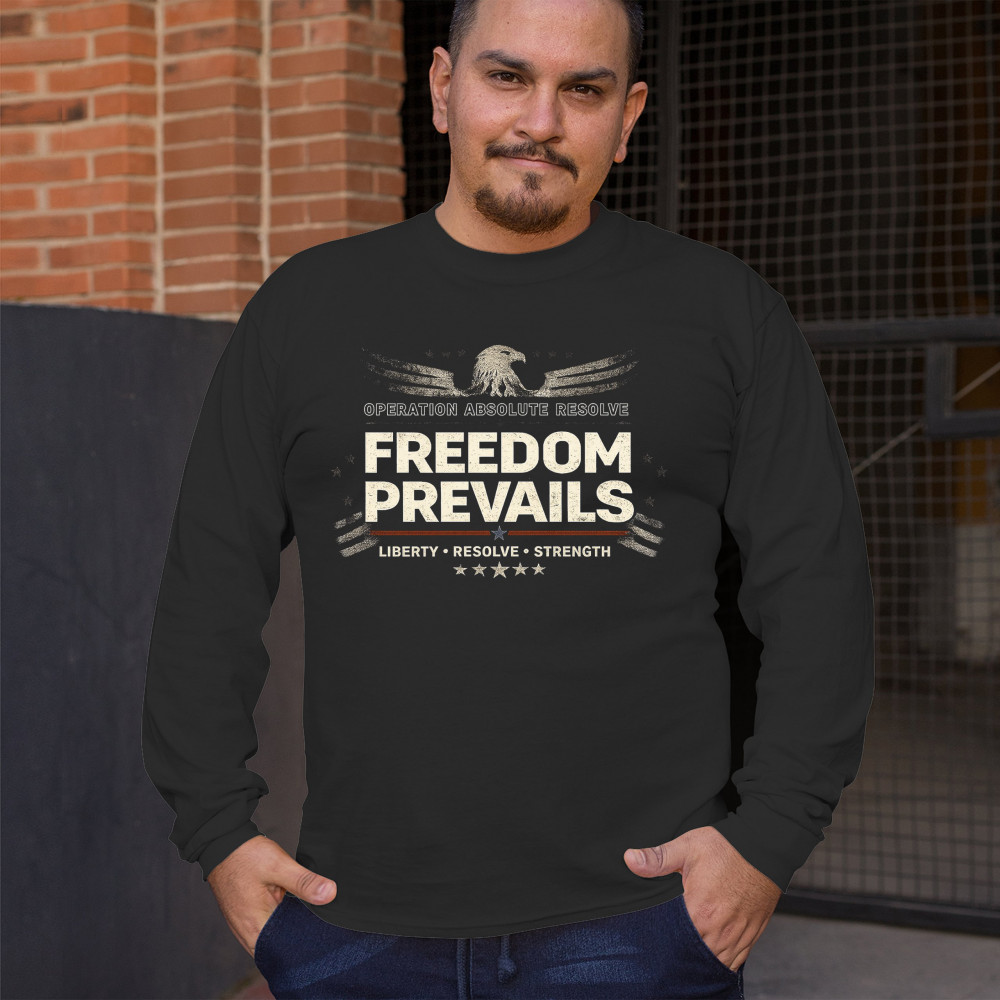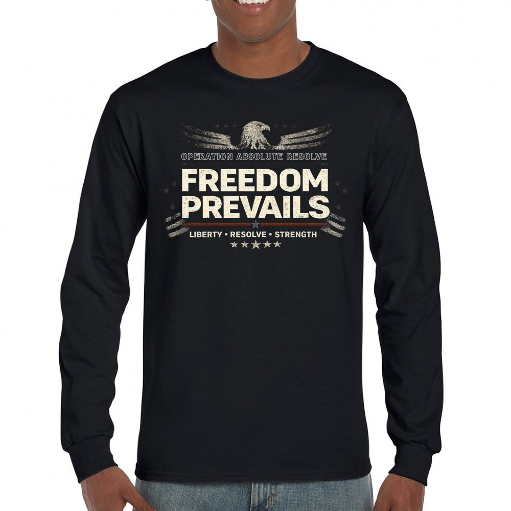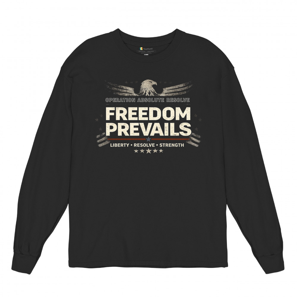 Patriotic “Freedom Prevails†design with classic eagle symbolism celebrating liberty, strength, and American resolve in a timeless style.