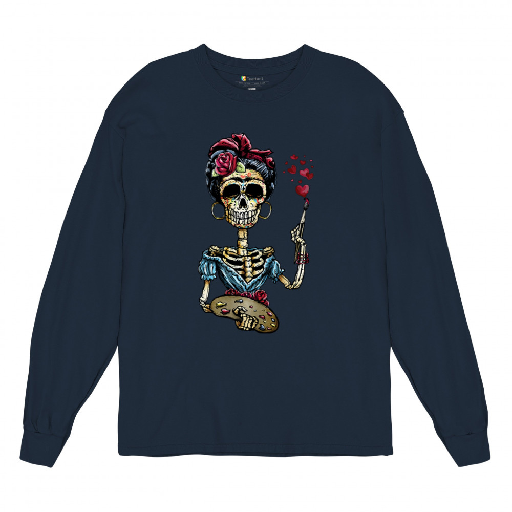FRIDA KAHLO SUGAR SKULL long sleeve t-shirt calavera mexican day of the dead navy blue