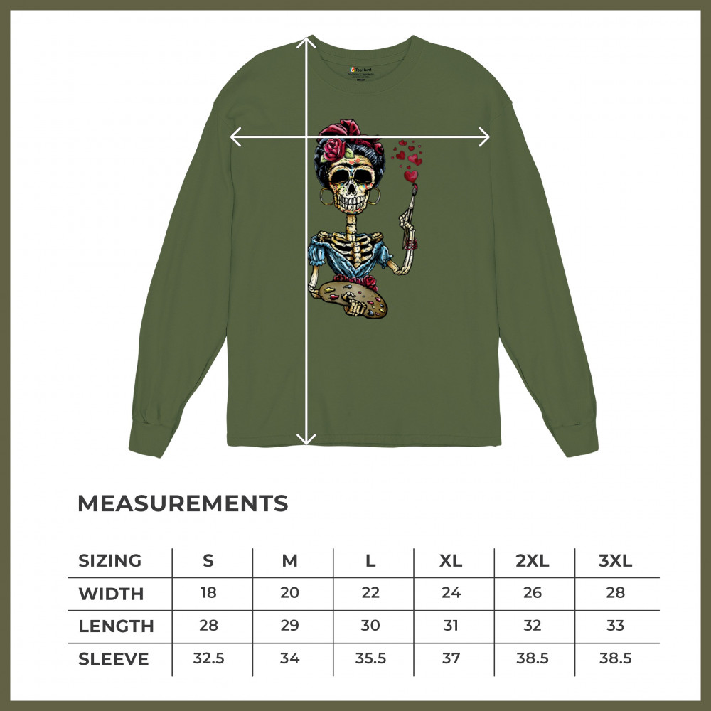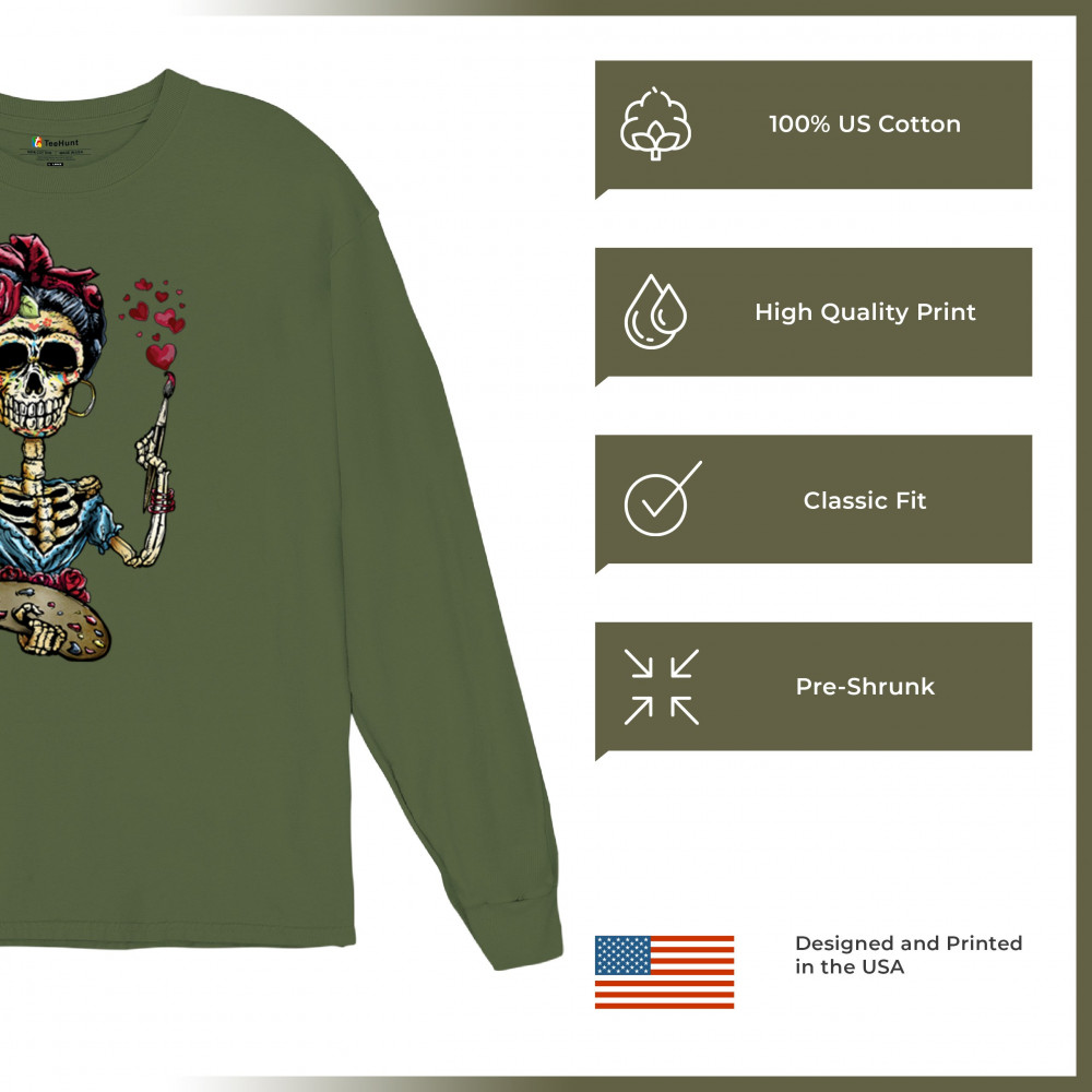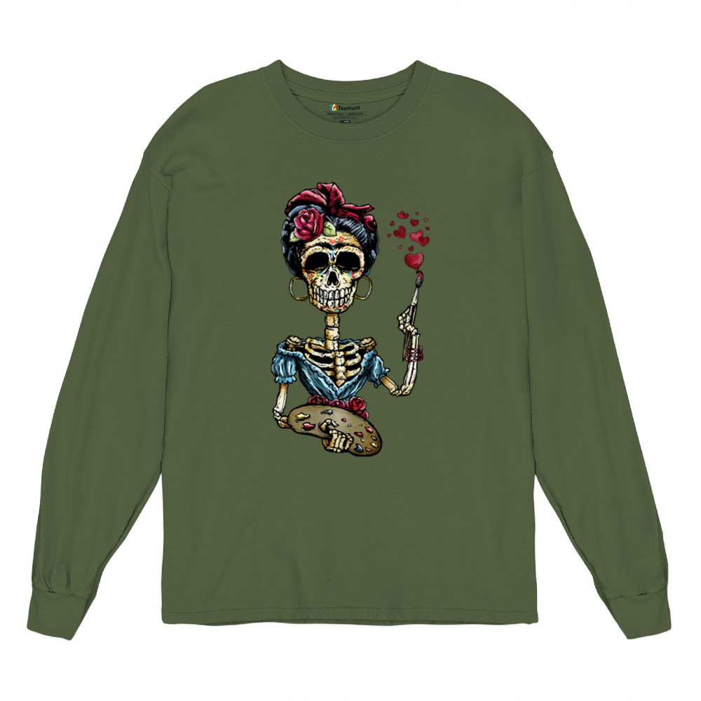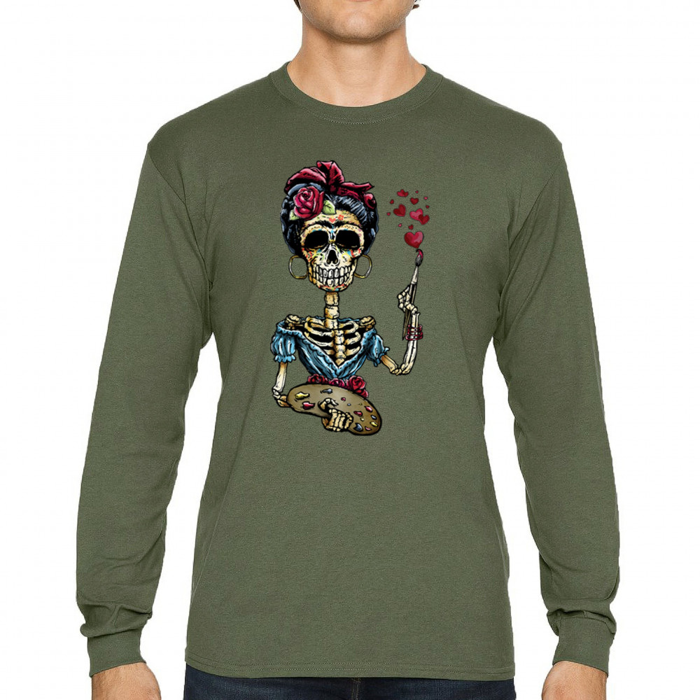 FRIDA KAHLO SUGAR SKULL long sleeve t-shirt calavera mexican day of the dead military green