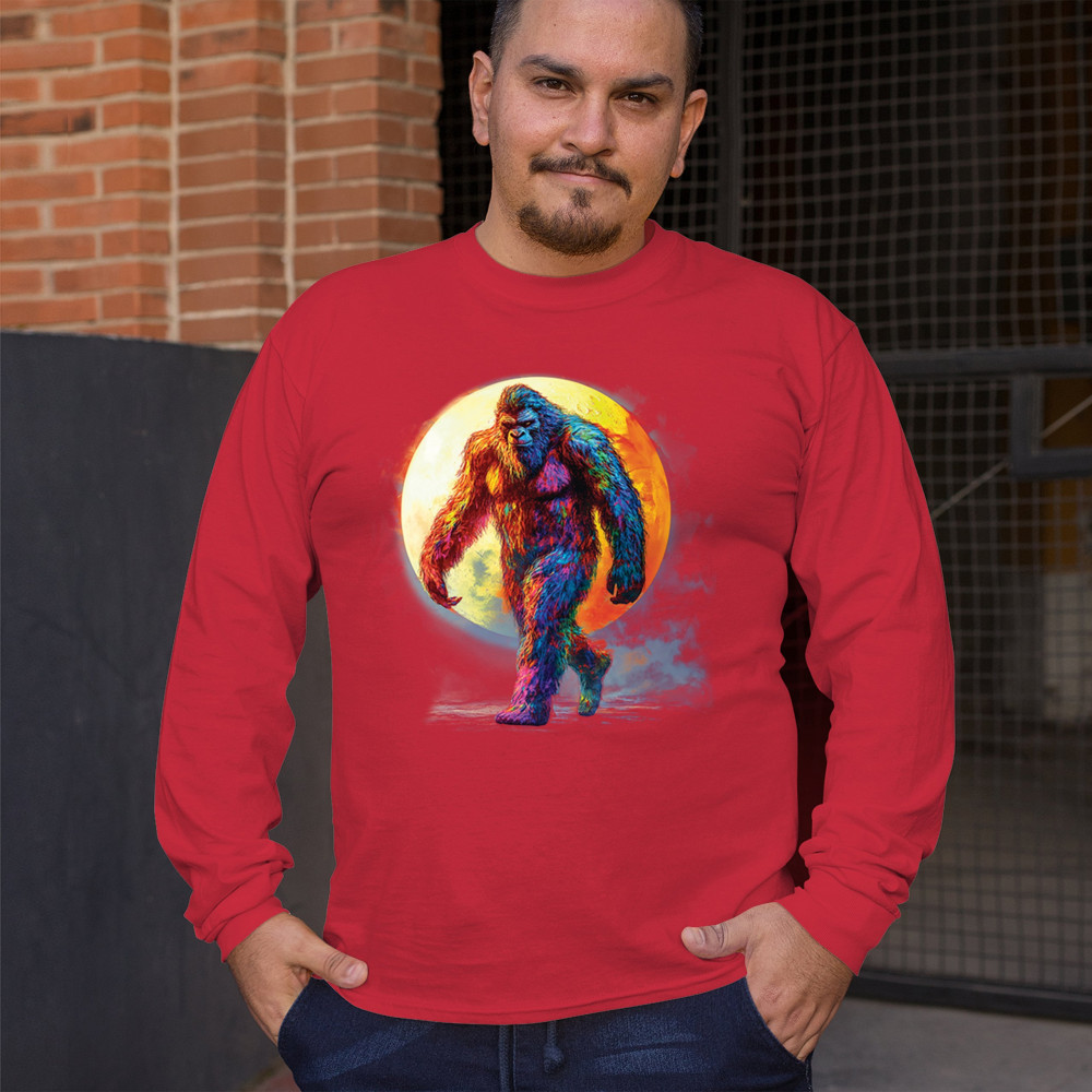 Rainbow Bigfoot under full moon design for cryptid lovers, festival goers, and psychedelic art fans. Bold, surreal, and eye-catching.