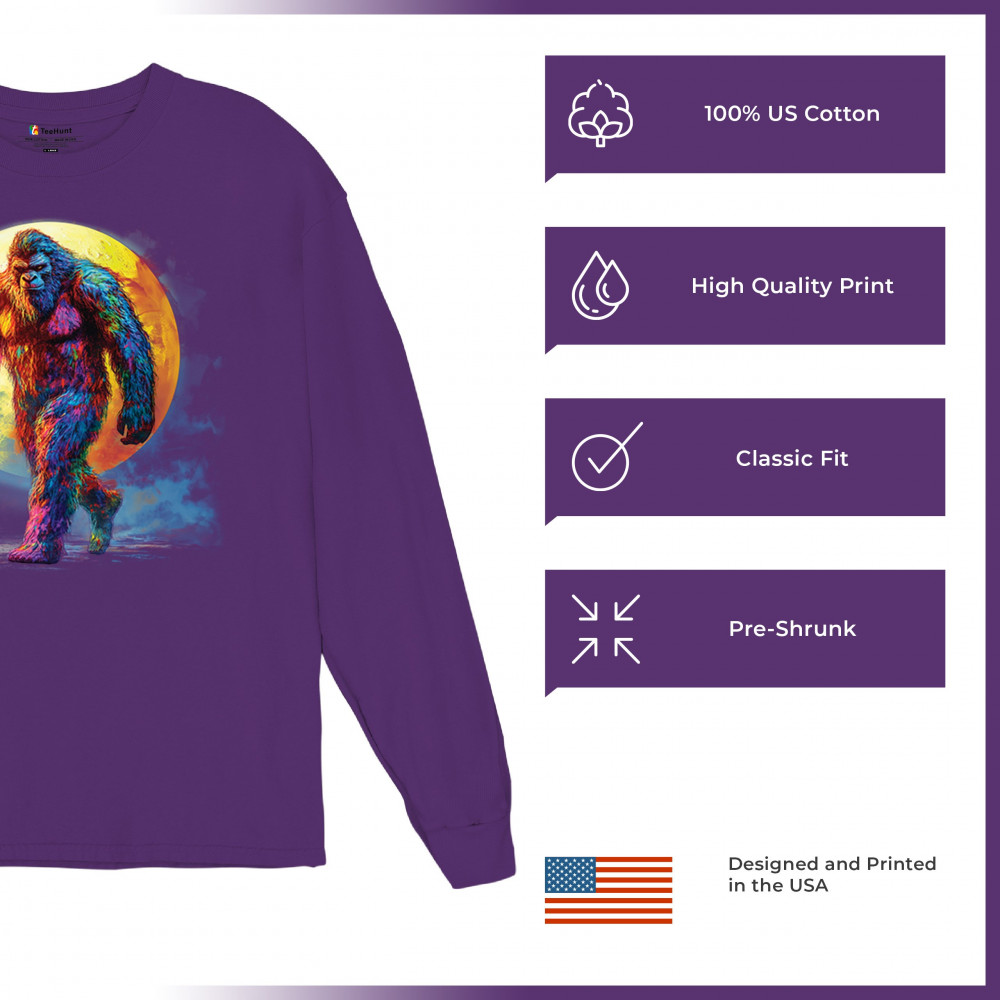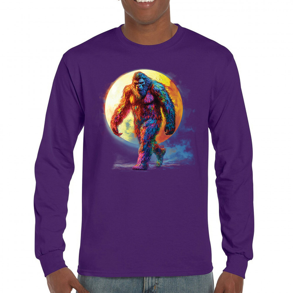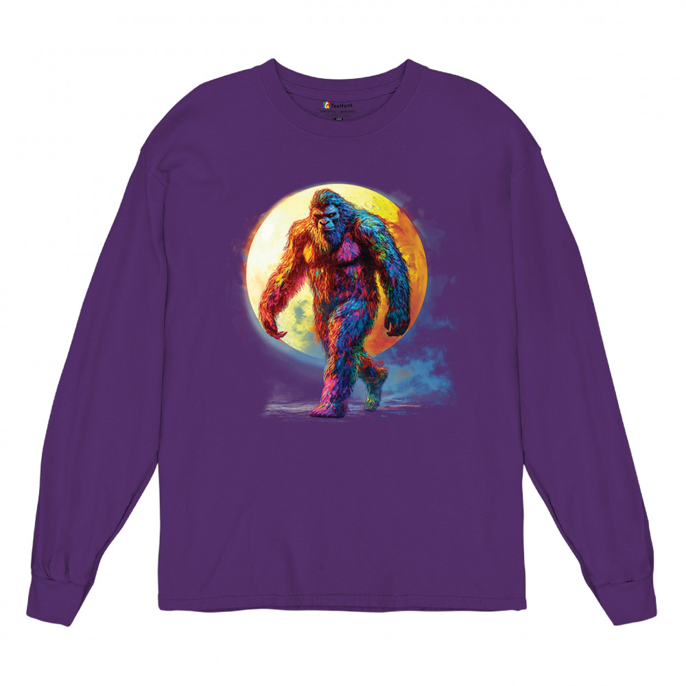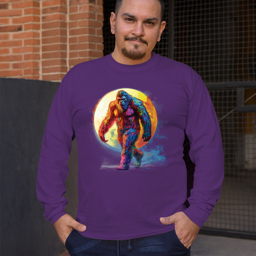 Rainbow Bigfoot under full moon design for cryptid lovers, festival goers, and psychedelic art fans. Bold, surreal, and eye-catching.