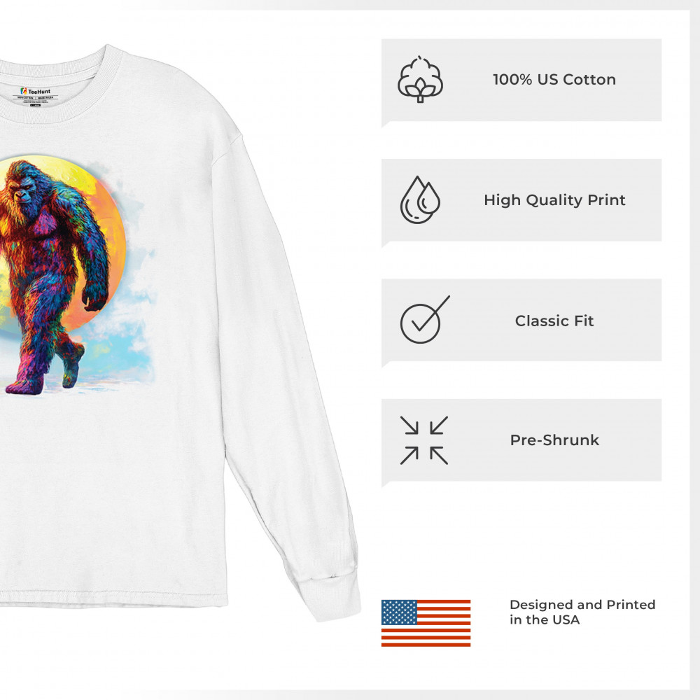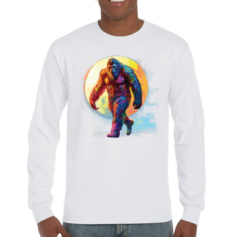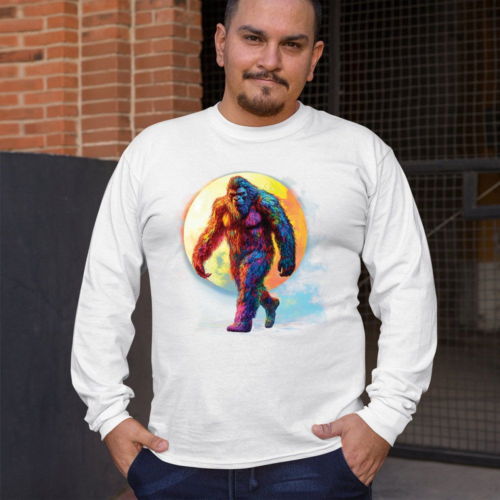 Rainbow Bigfoot under full moon design for cryptid lovers, festival goers, and psychedelic art fans. Bold, surreal, and eye-catching.
