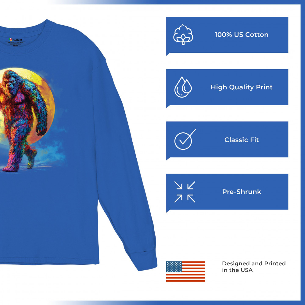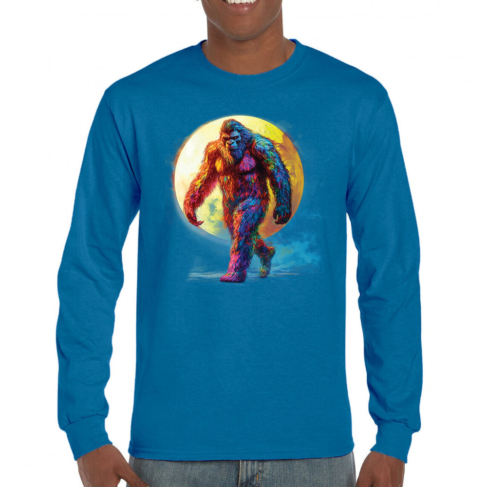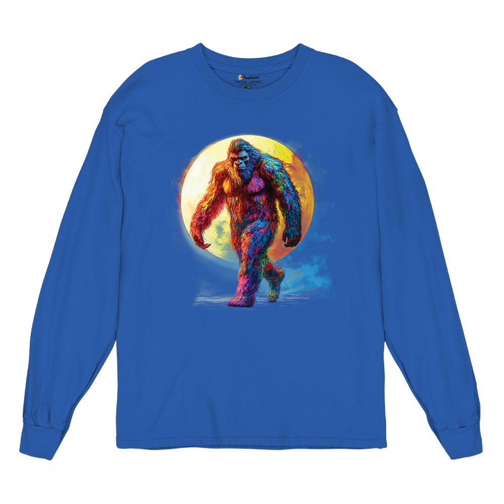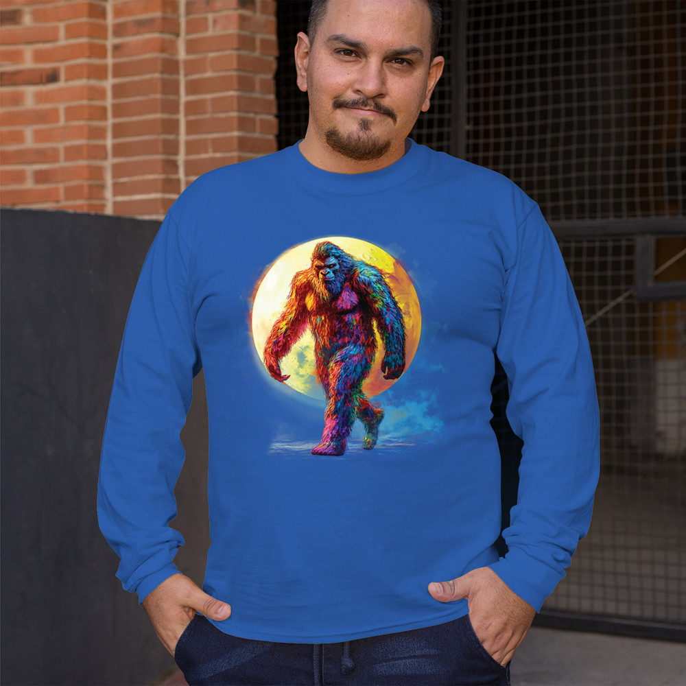 Rainbow Bigfoot under full moon design for cryptid lovers, festival goers, and psychedelic art fans. Bold, surreal, and eye-catching.