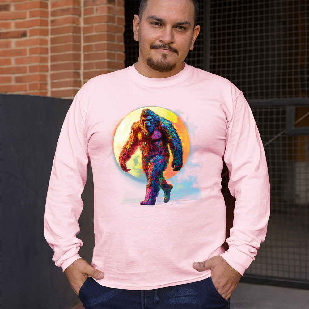 Step into a vivid cryptid dream with this rainbow Bigfoot design. Featuring a multicolor Sasquatch walking past a full moon, it fuses mythical mystery with bold, surreal art. Perfect for festival fans, night hikers, and lovers of the unexplained, this design brings eye-catching style to your wild side.