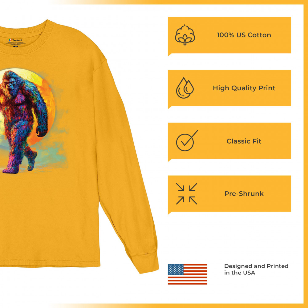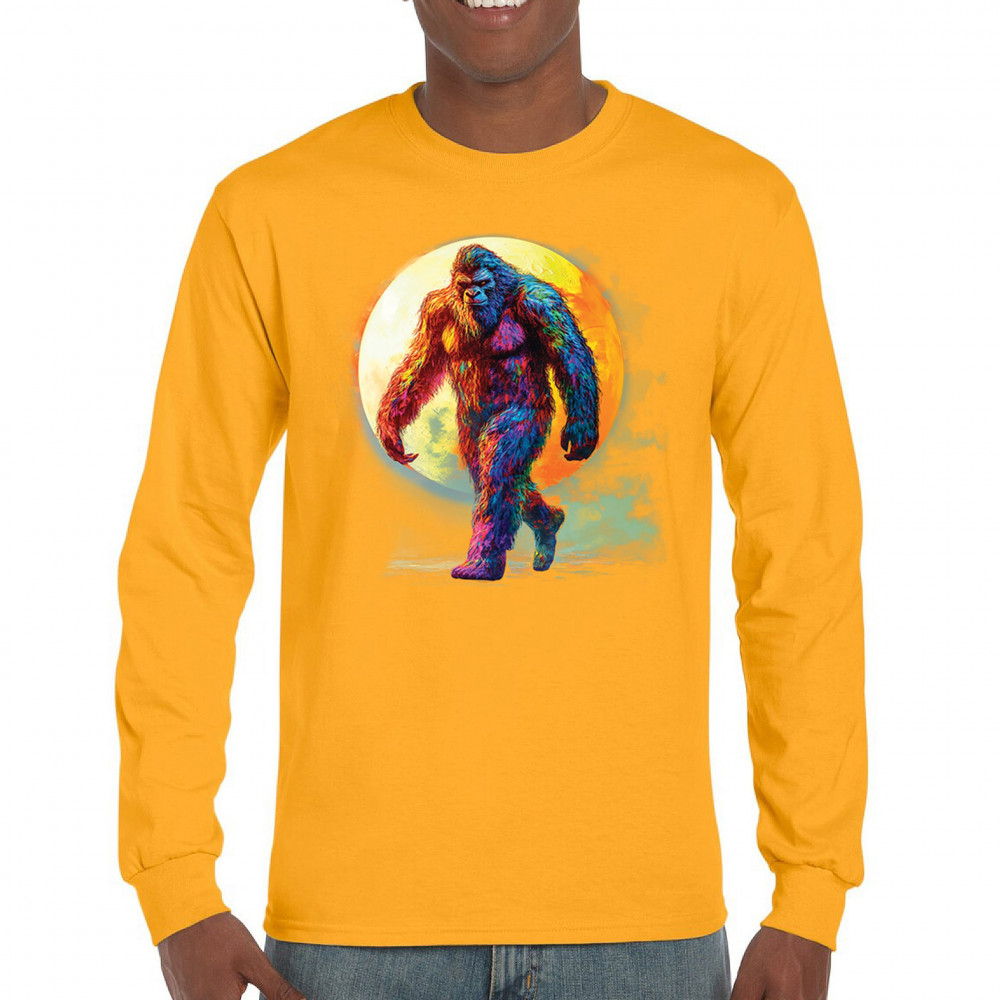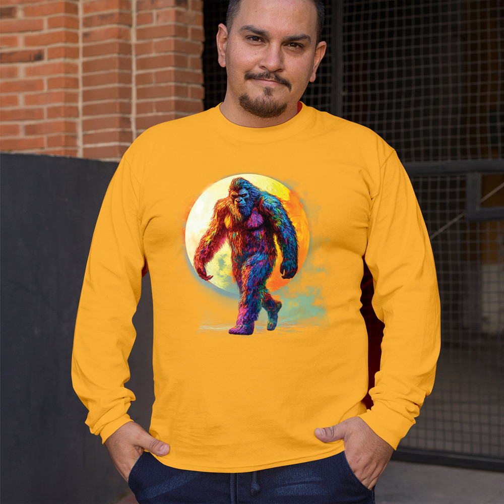 Rainbow Bigfoot under full moon design for cryptid lovers, festival goers, and psychedelic art fans. Bold, surreal, and eye-catching.