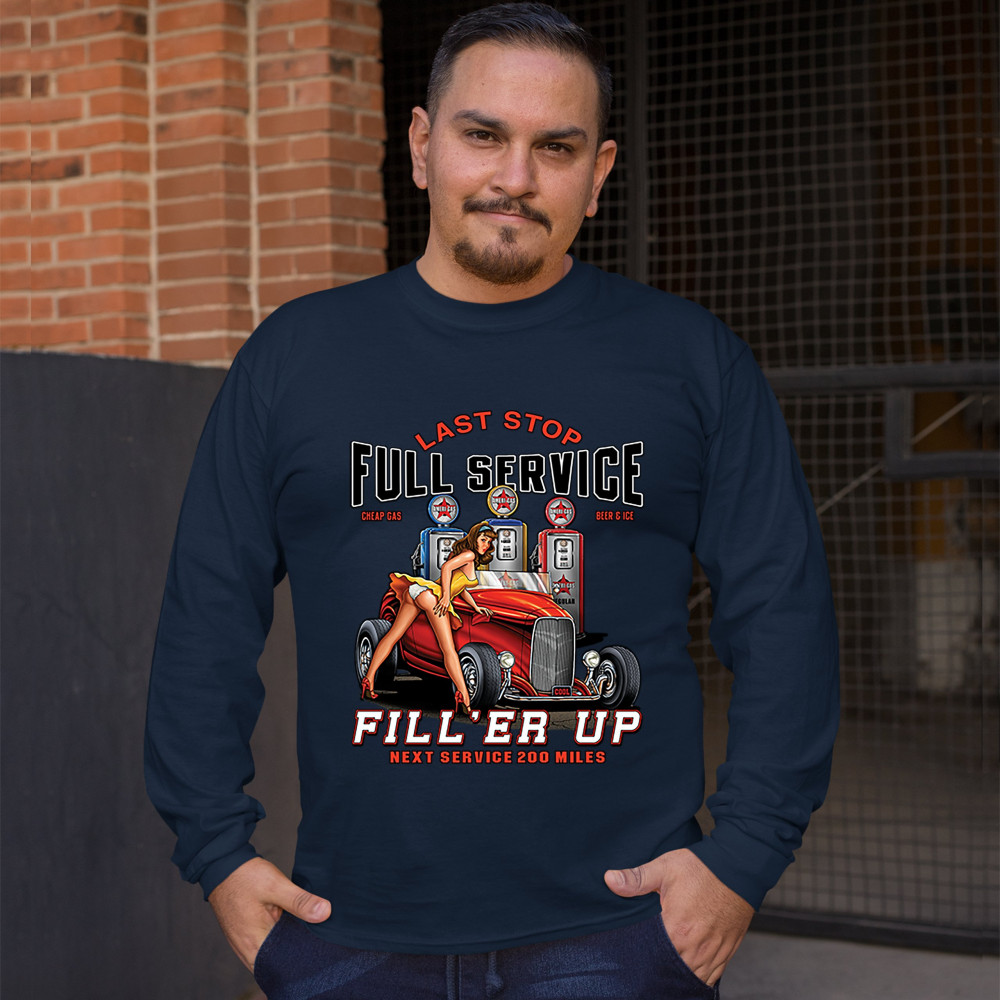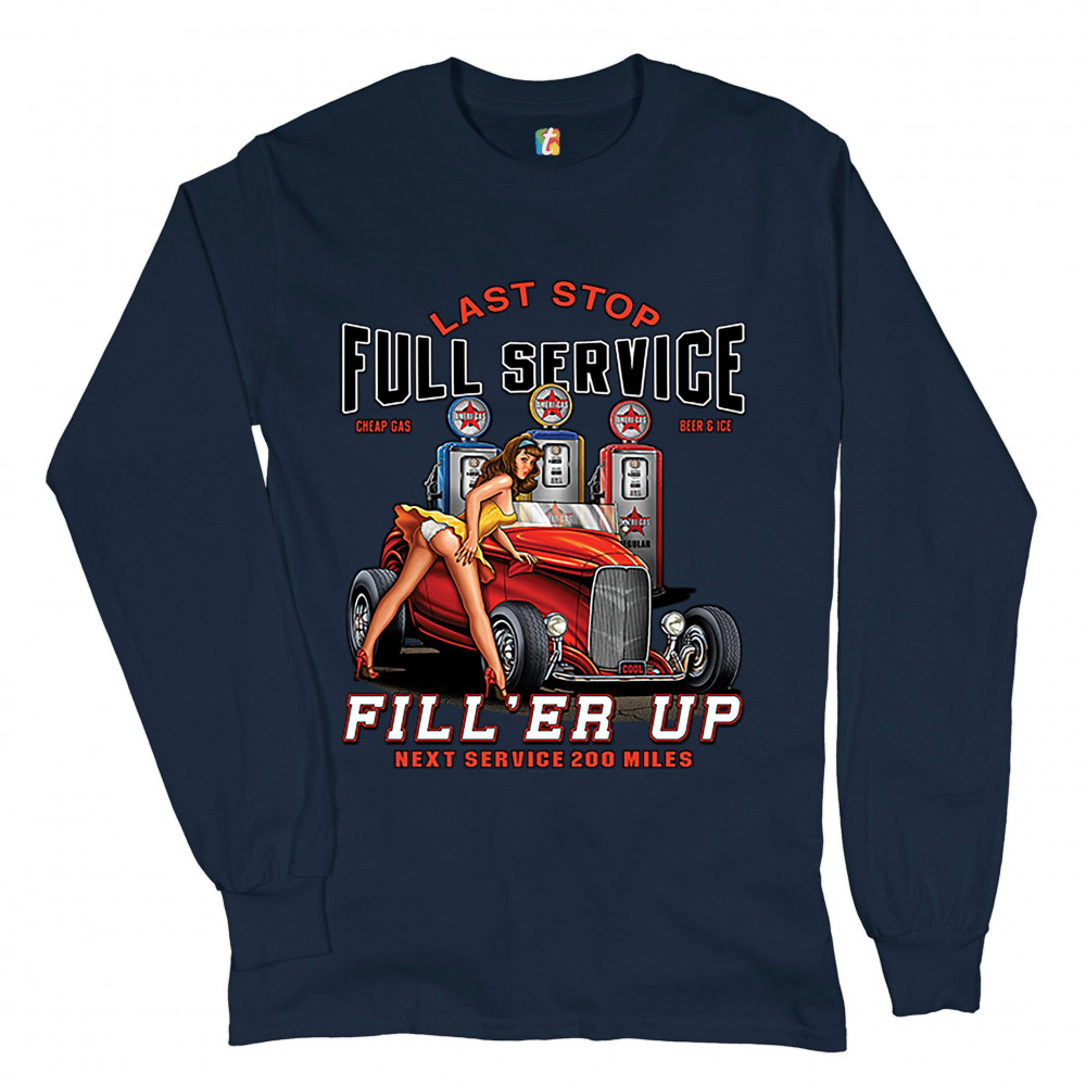 FULL SERVICE FILL 'ER UP long sleeve t-shirt hot rod pin-up girl old school navy blue