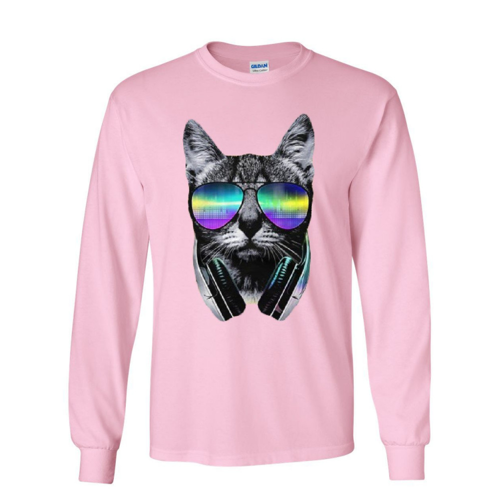 FUNNY DJ CAT long sleeve t-shirt music kitten headphones and glasses light pink