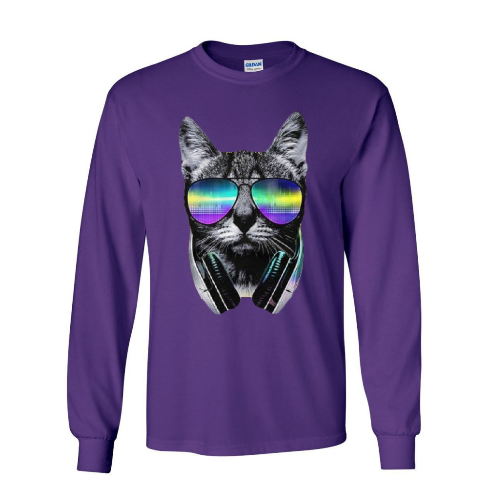 FUNNY DJ CAT long sleeve t-shirt music kitten headphones and glasses purple