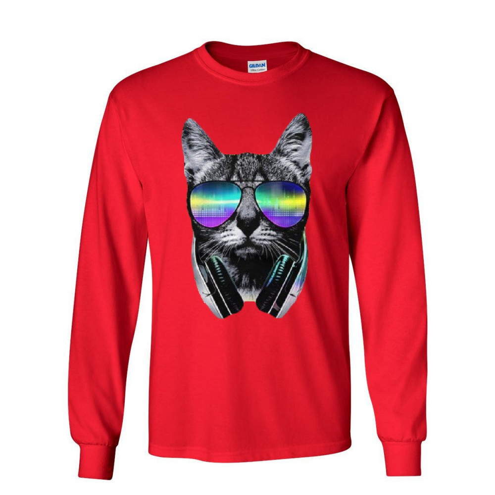 FUNNY DJ CAT long sleeve t-shirt music kitten headphones and glasses red