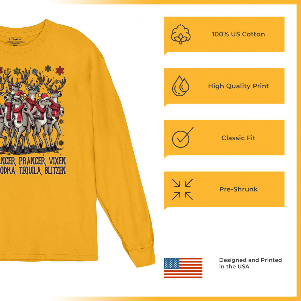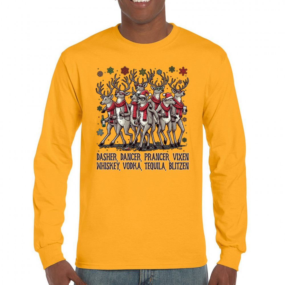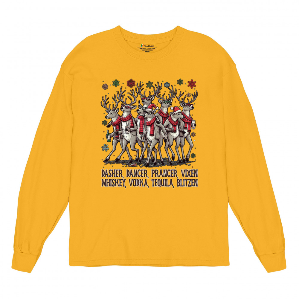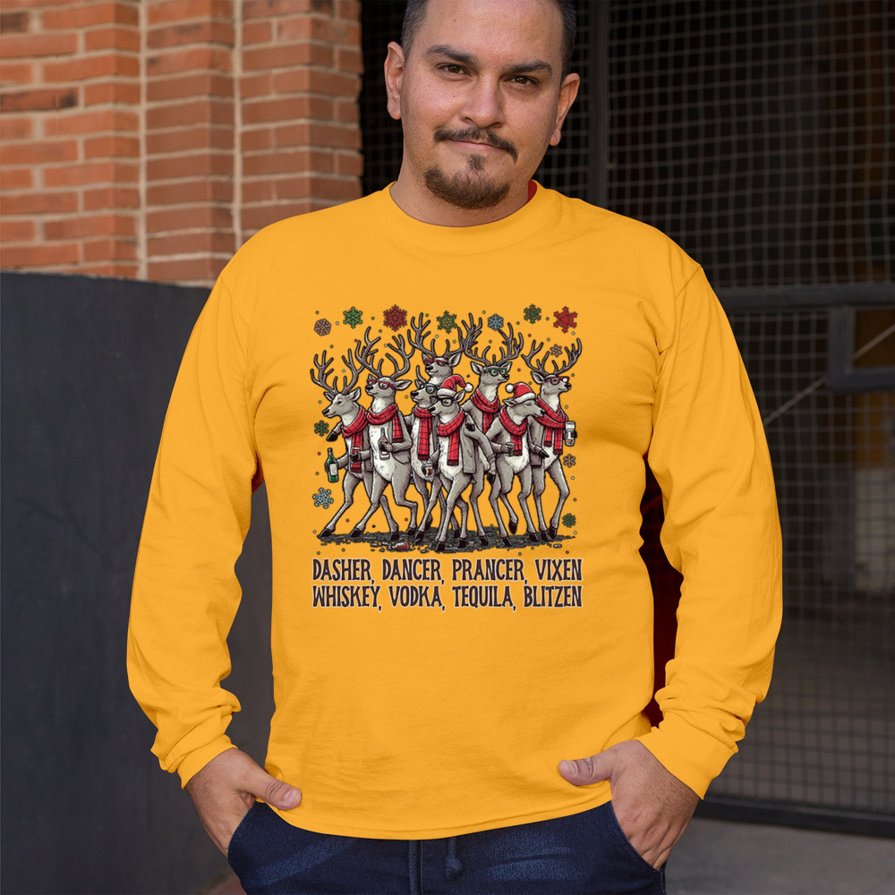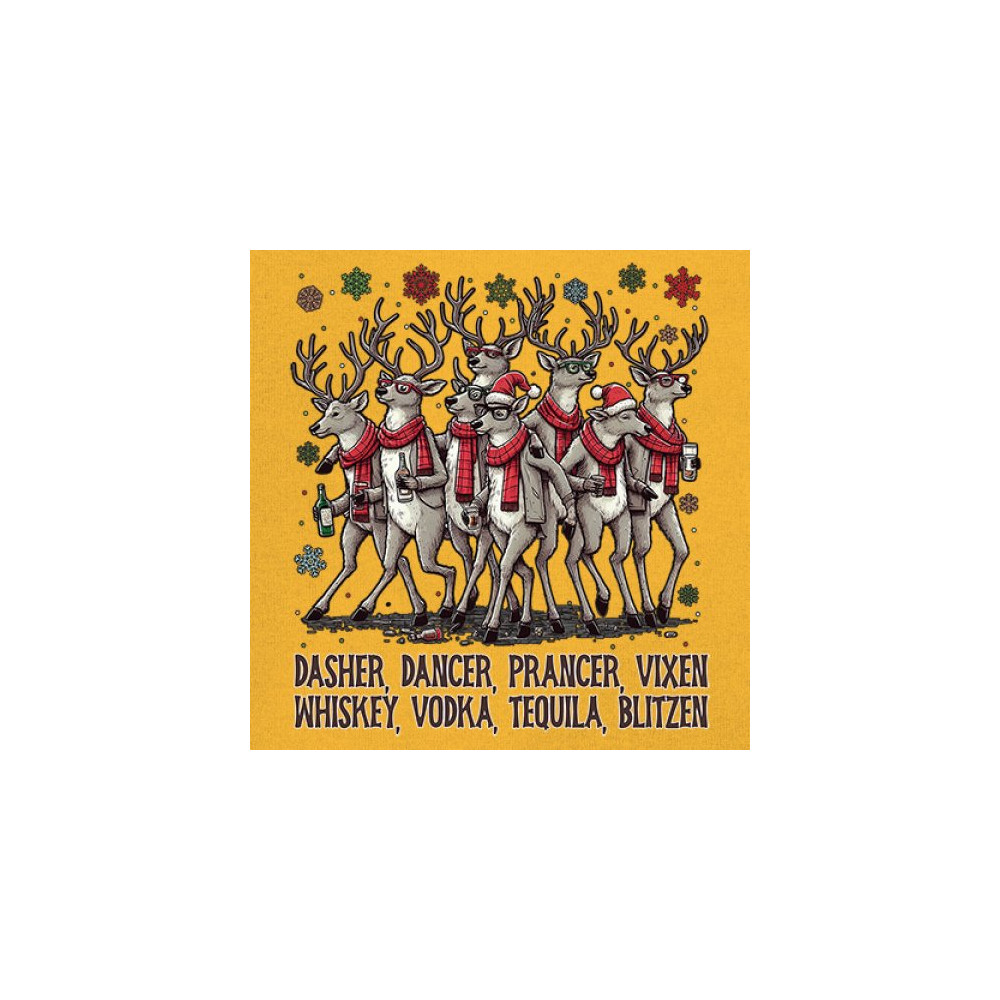 This funny holiday design features a squad of drinking reindeer carrying bottles and dressed in scarves for the ultimate Christmas party vibe. Great for bar crawls, office parties, winter gatherings, adult holiday events, white elephant exchanges, festive nights out, and anyone who loves spirited Christmas humor with a cheeky personality.