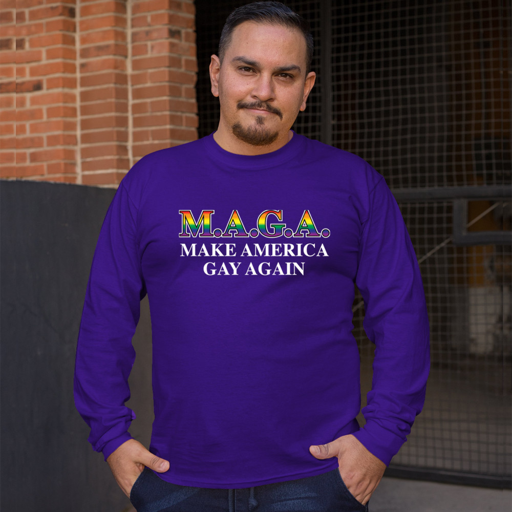A funny print saying "M.A.G.A. Make America Gay Again". The acronym "M.A.G.A." is painted in the colors of lgbt rainbow. Wear it to show your support for the LGBTQ community.