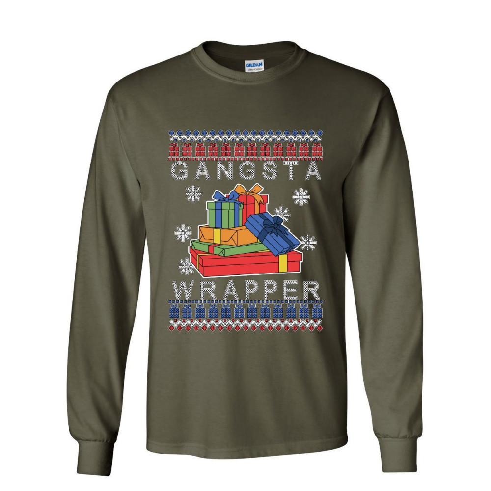 GANGSTA WRAPPER ugly sweater long sleeve t-shirt merry jolly christmas xmas tee military green