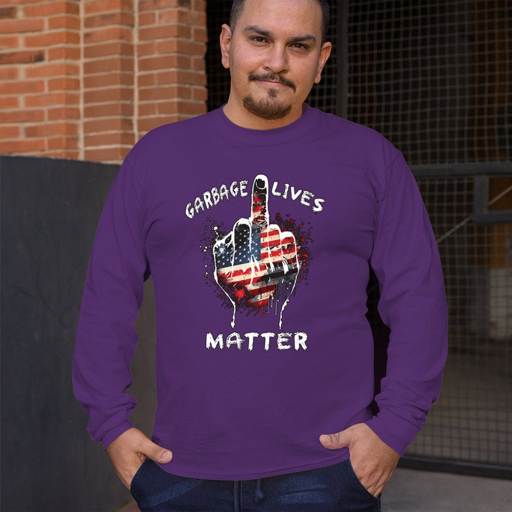 The "Garbage Lives Matter" design is a fearless expression of American values and pride. With the American flag as its centerpiece, this bold and patriotic design speaks volumes to Trump supporters, conservatives, and those who believe in the people's mandate. Join the fight for America First, never surrender, and celebrate the Red Wave movement with this striking statement piece.