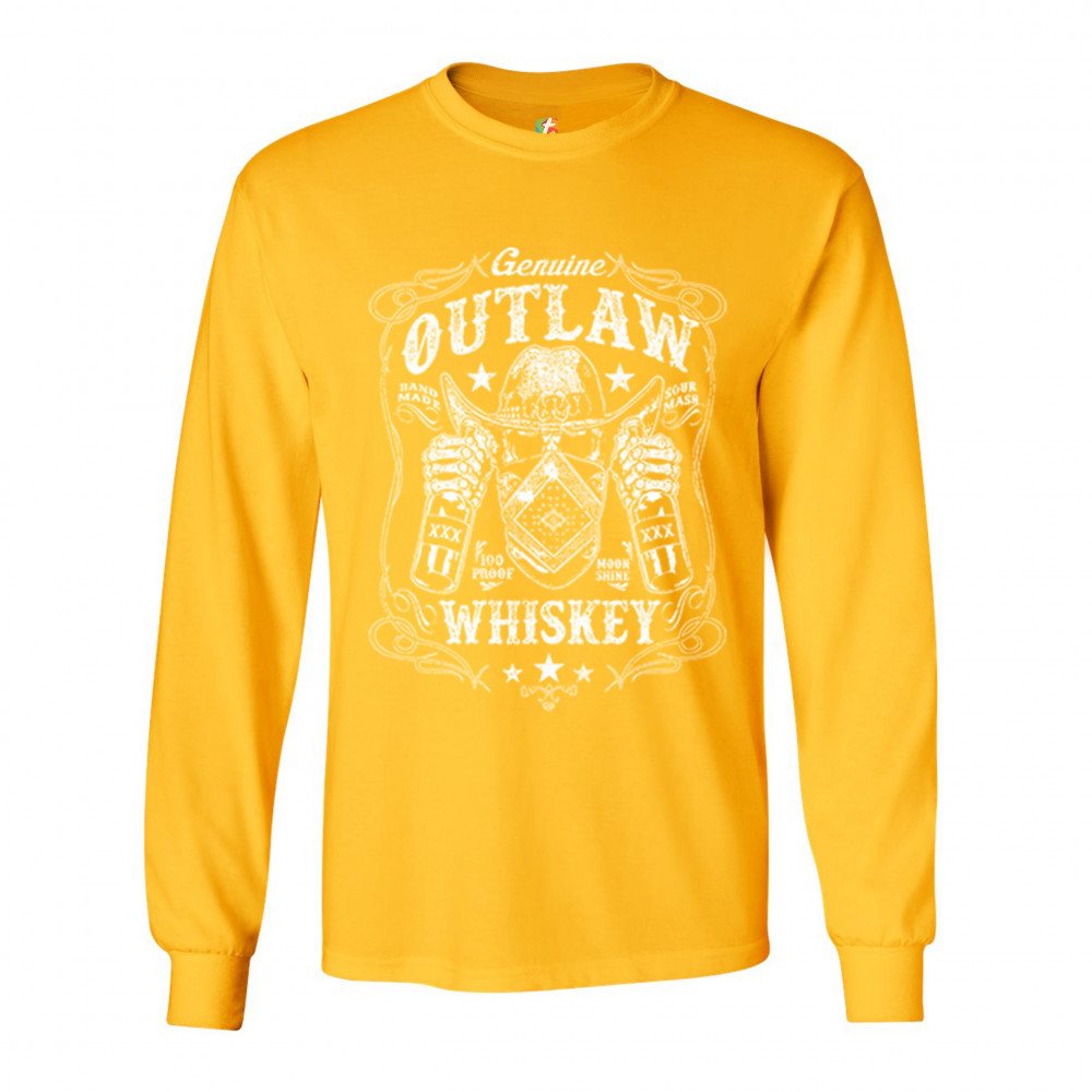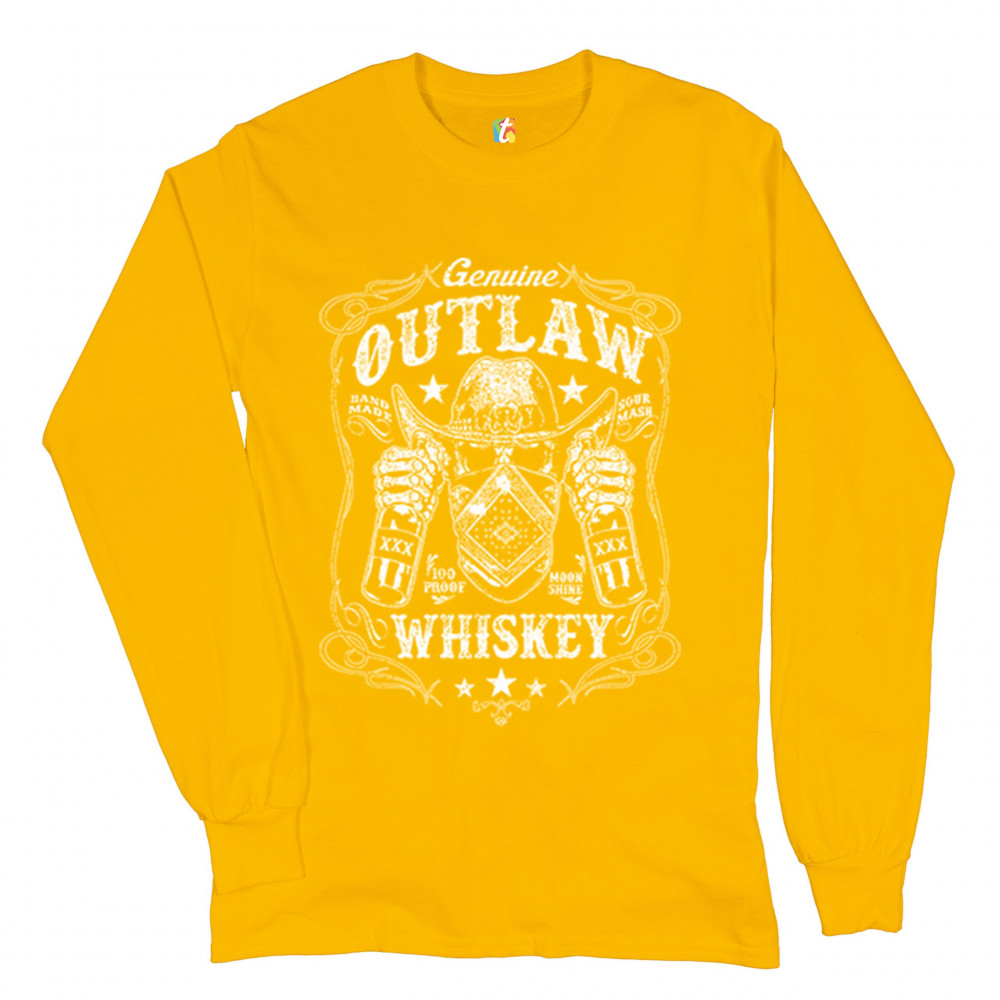 A print featuring a skeleton wearing a bandana and a cowboy hat holding a bottle in each of it's hands. The print says: "Genuine Outlaw Whiskey, Handmade Sour Mash, 100 Proof Moonshine". A great choice for an old school person who doesn't mind a glass or
