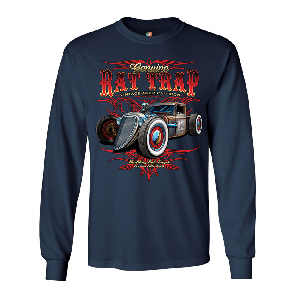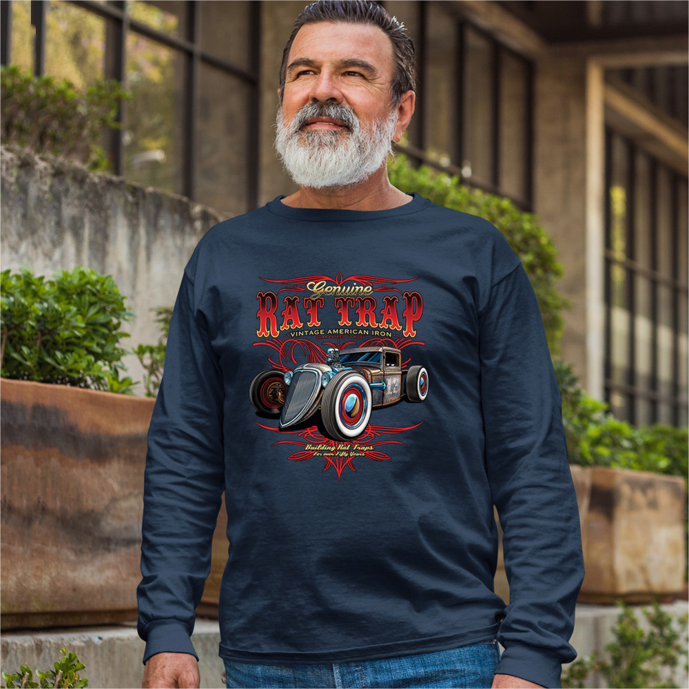 A print featuring a rusty rat rod with a number "13" on it's door. The prints says: "genuine rat trap, vintage American iron, guaranteed to rust" above the car and "bulding rat traps for over fifty years" below it. Great for Route 66 and hot rod fans.