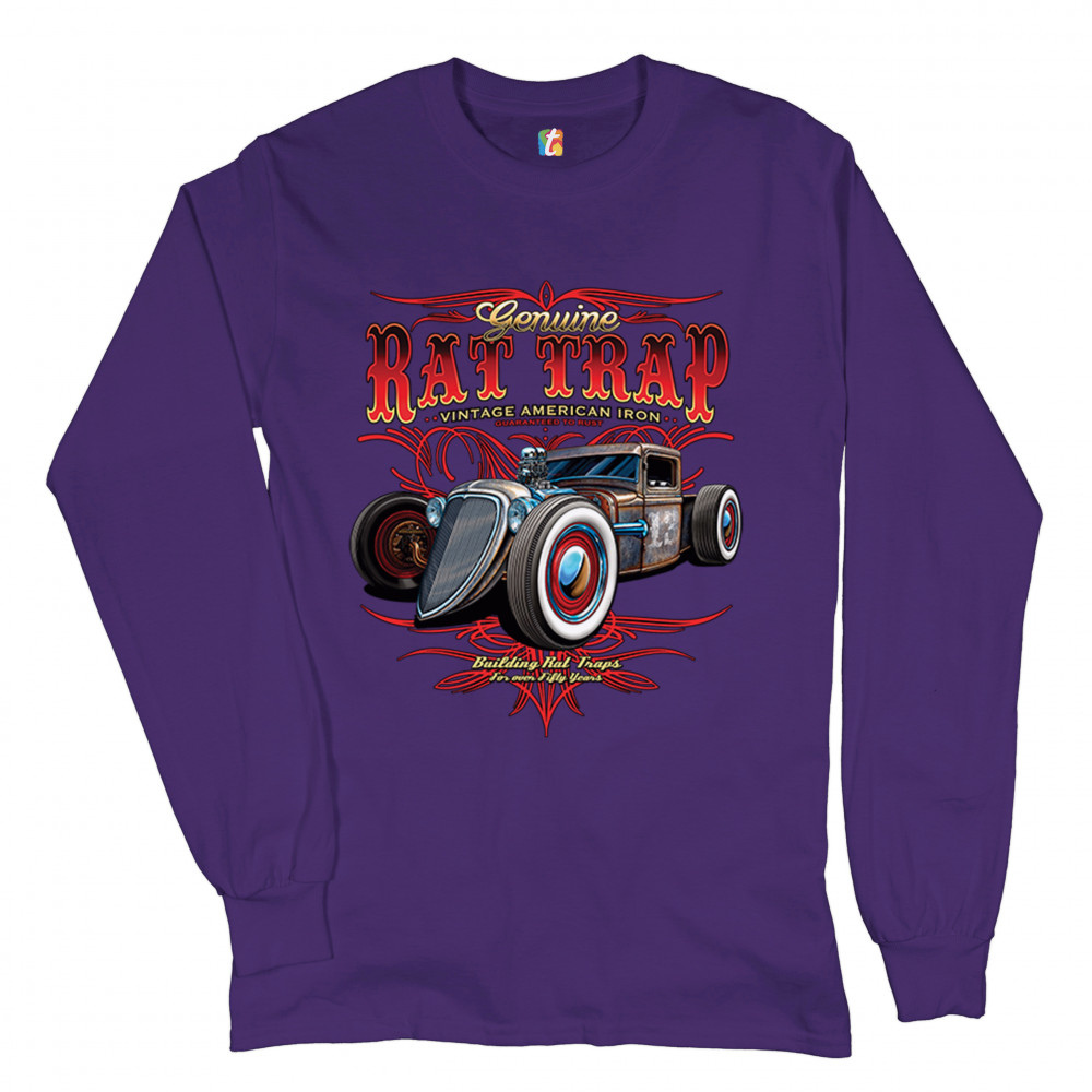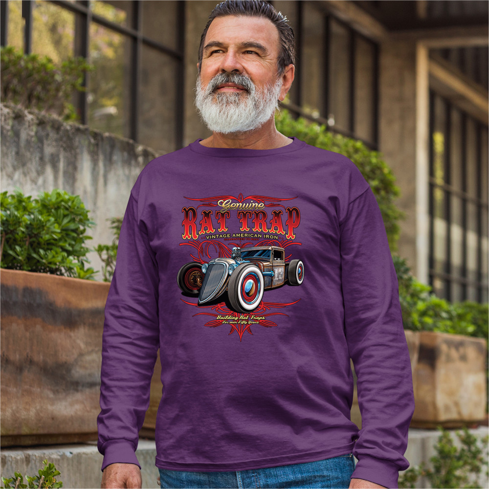 A print featuring a rusty rat rod with a number "13" on it's door. The prints says: "genuine rat trap, vintage American iron, guaranteed to rust" above the car and "bulding rat traps for over fifty years" below it. Great for Route 66 and hot rod fans.