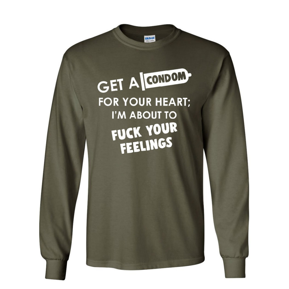 GET A CONDOM FOR YOUR HEART long sleeve t-shirt funny rude offensive humor tee military green
