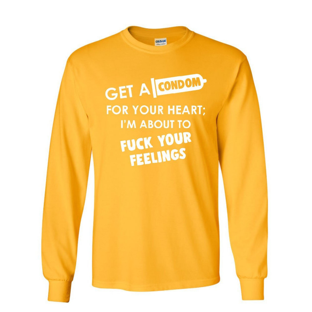 GET A CONDOM FOR YOUR HEART long sleeve t-shirt funny rude offensive humor tee yellow