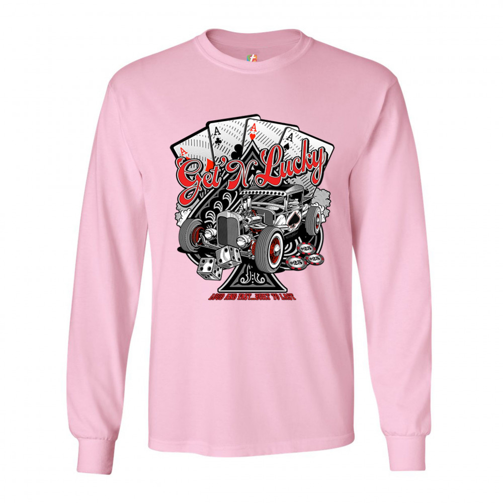 A print featuring a hot rod and a giant ace of spades behind it. In the background there are four aces of every suit. In front of the car there are 2 dices and several casino chips. The print says: "Get'n lucky, louad and fast… built to last". A great cho
