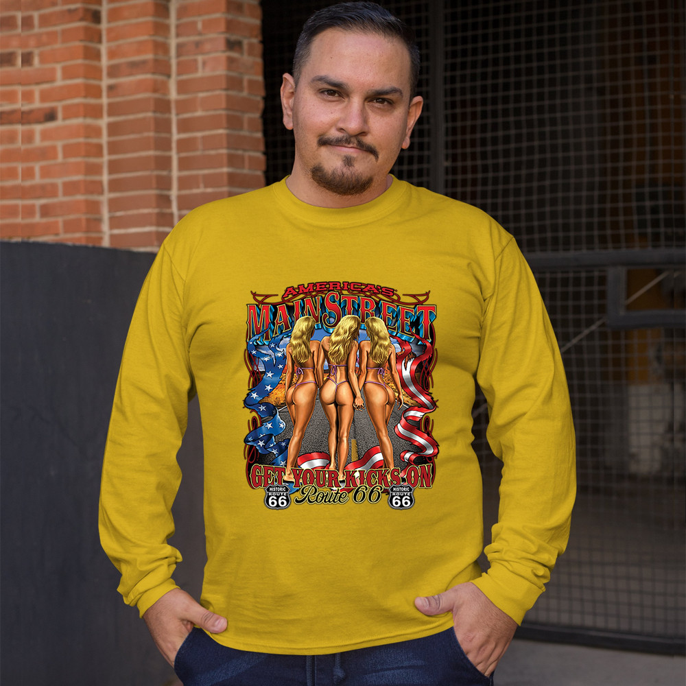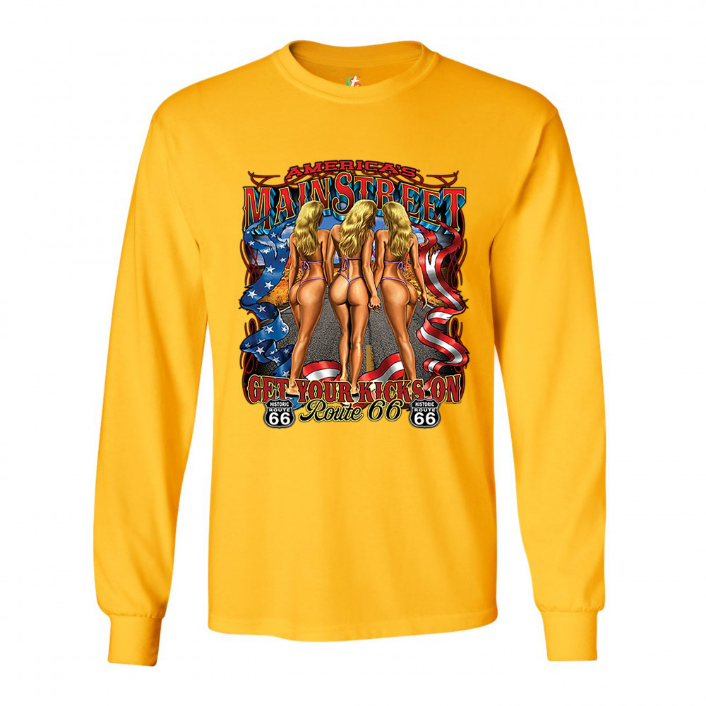 A print featuring three scantily-clad blondes holding each other's hands walking on a highway. The print says: "America's Main Street, Get Your Kicks on Route 66" and also features a ribbon with stars and stripes on it and two "Historic Route 66" signs. A