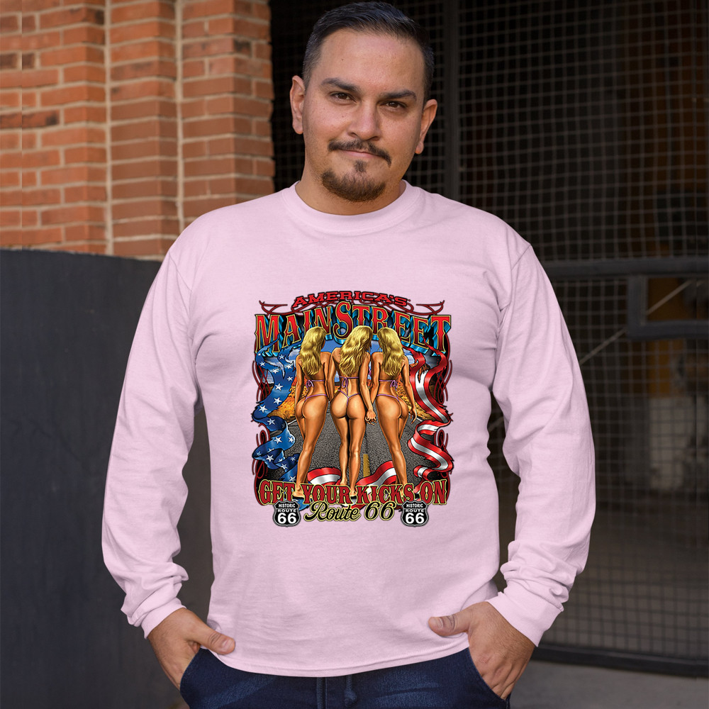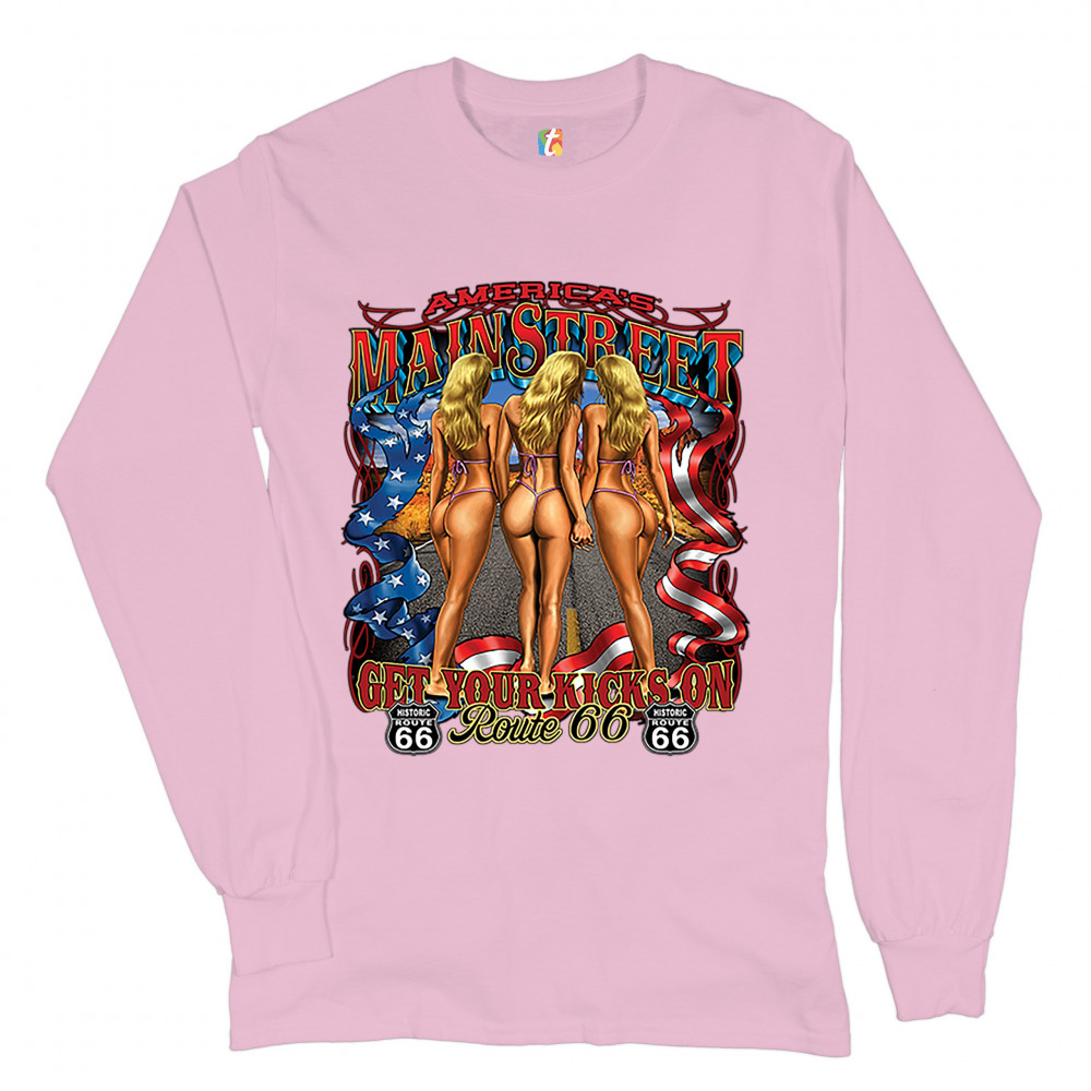 A print featuring three scantily-clad blondes holding each other's hands walking on a highway. The print says: "America's Main Street, Get Your Kicks on Route 66" and also features a ribbon with stars and stripes on it and two "Historic Route 66" signs. A