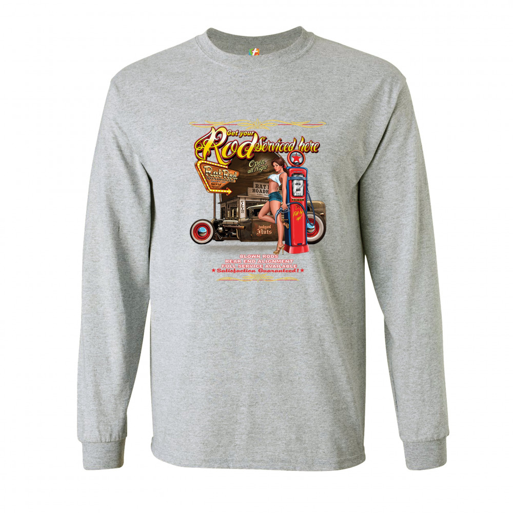 A print featuring a sexy pin-up girl leaning on a gas pump. There is a hot rod behind her and a "Rat Rod Roudhouse" in the background. The print also includes a bunch of innuendos: "get your rod serviced here, blown rods, rear end alignment, full service
