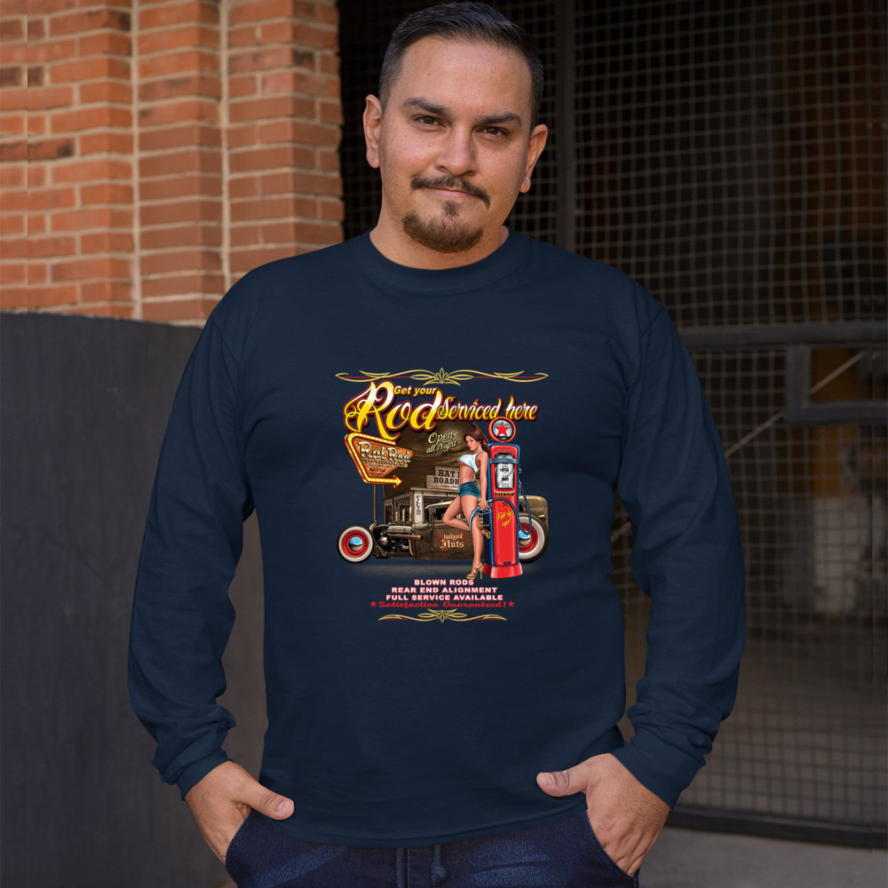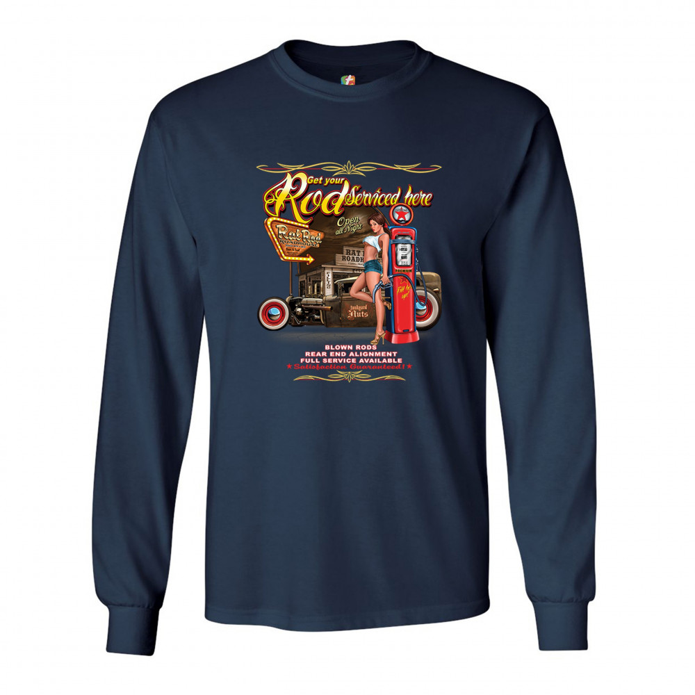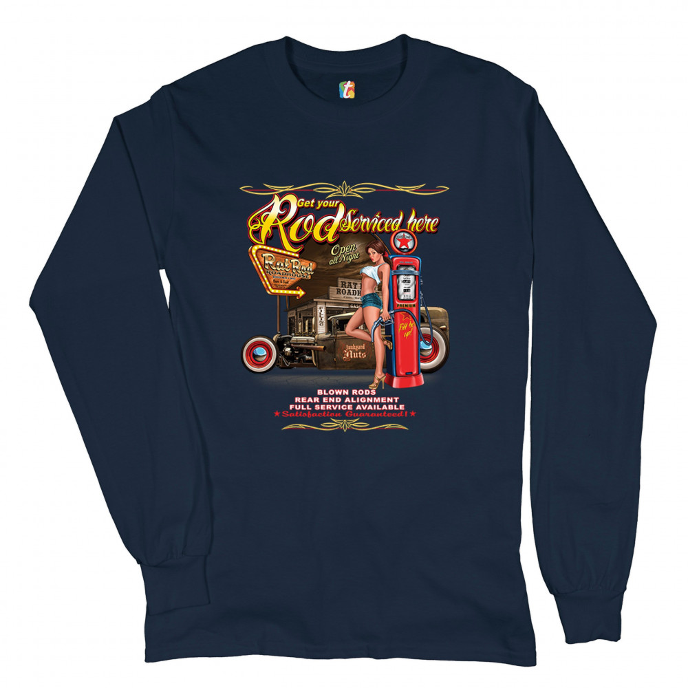 GET YOUR ROD SERVICES HERE long sleeve t-shirt route 66 hot rod pin-up girl navy blue