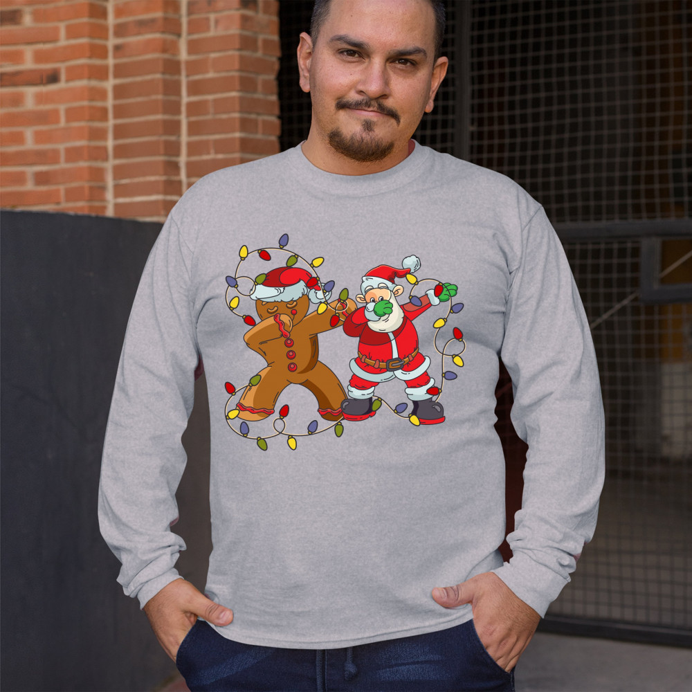 GINGERBREAD MAN AND SANTA CLAUS DAB DANCE long sleeve t-shirt merry christmas gray