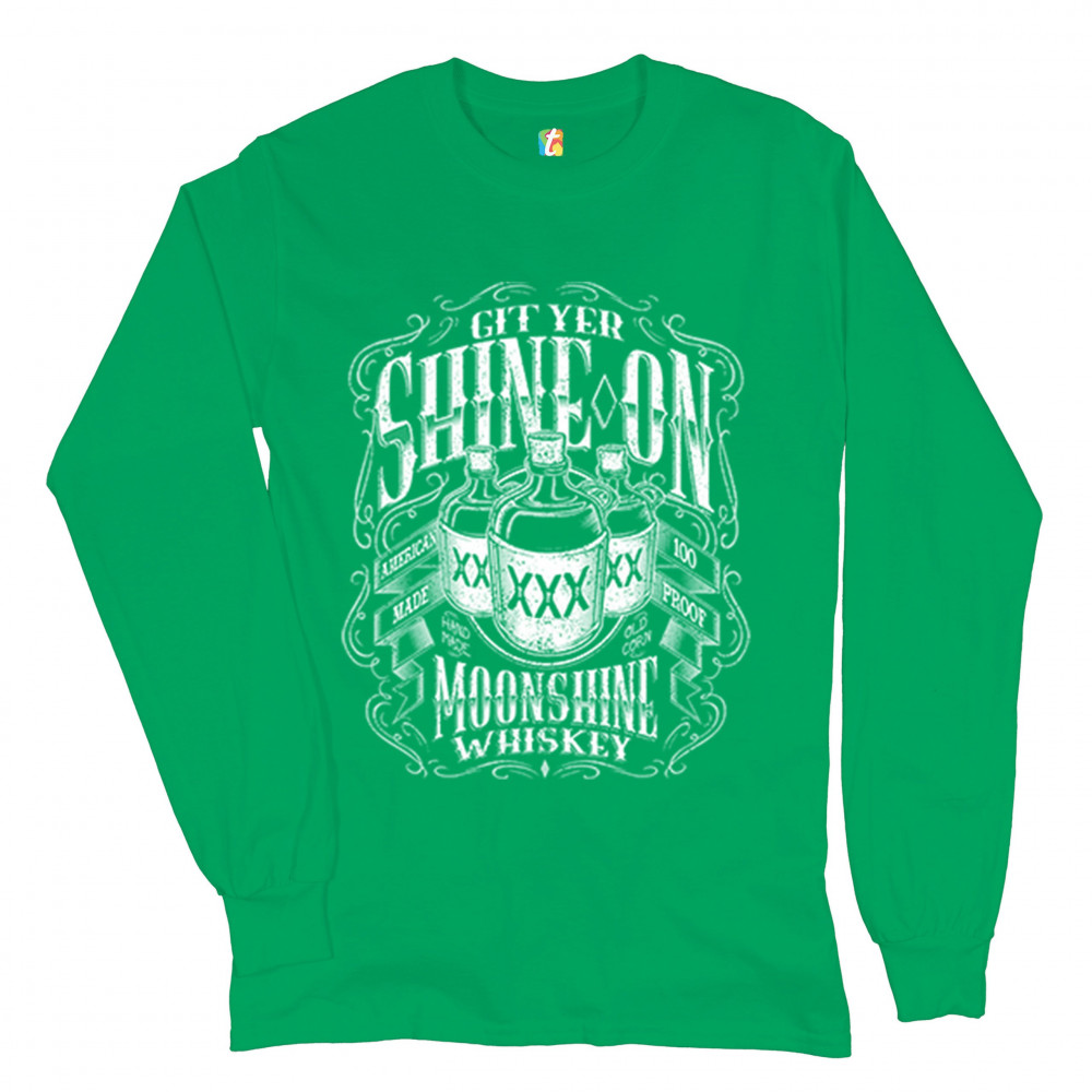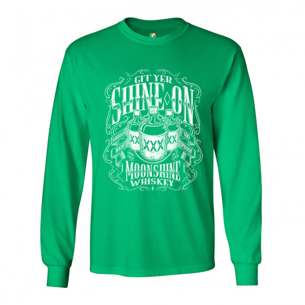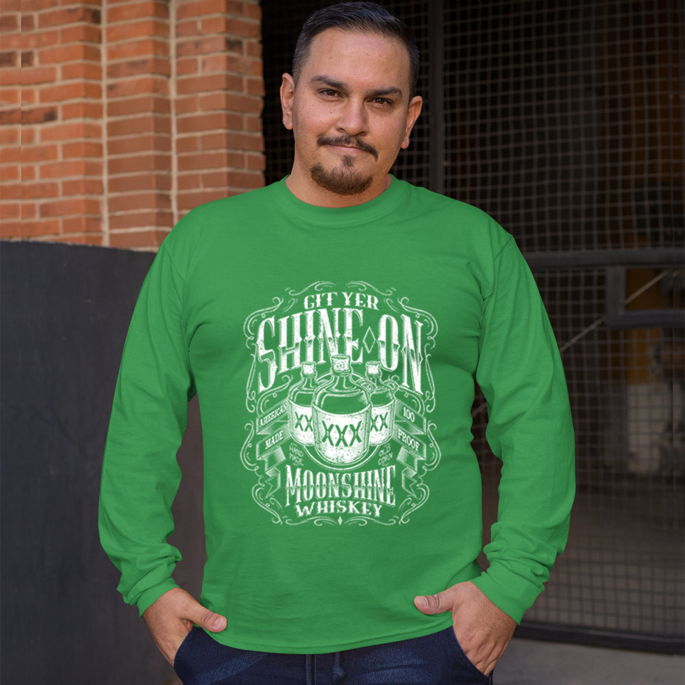 GIT YER SHINE ON MOONSHINE WHISKEY long sleeve t-shirt xxx mason jars drinking green