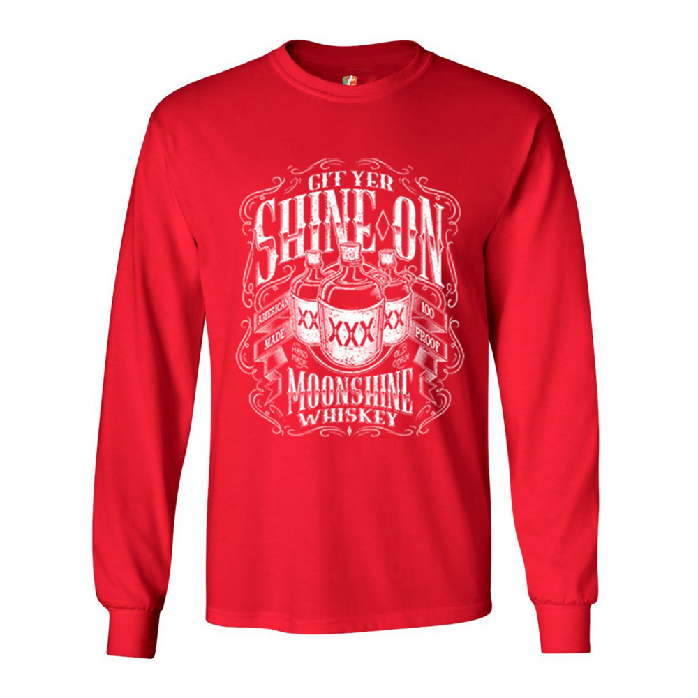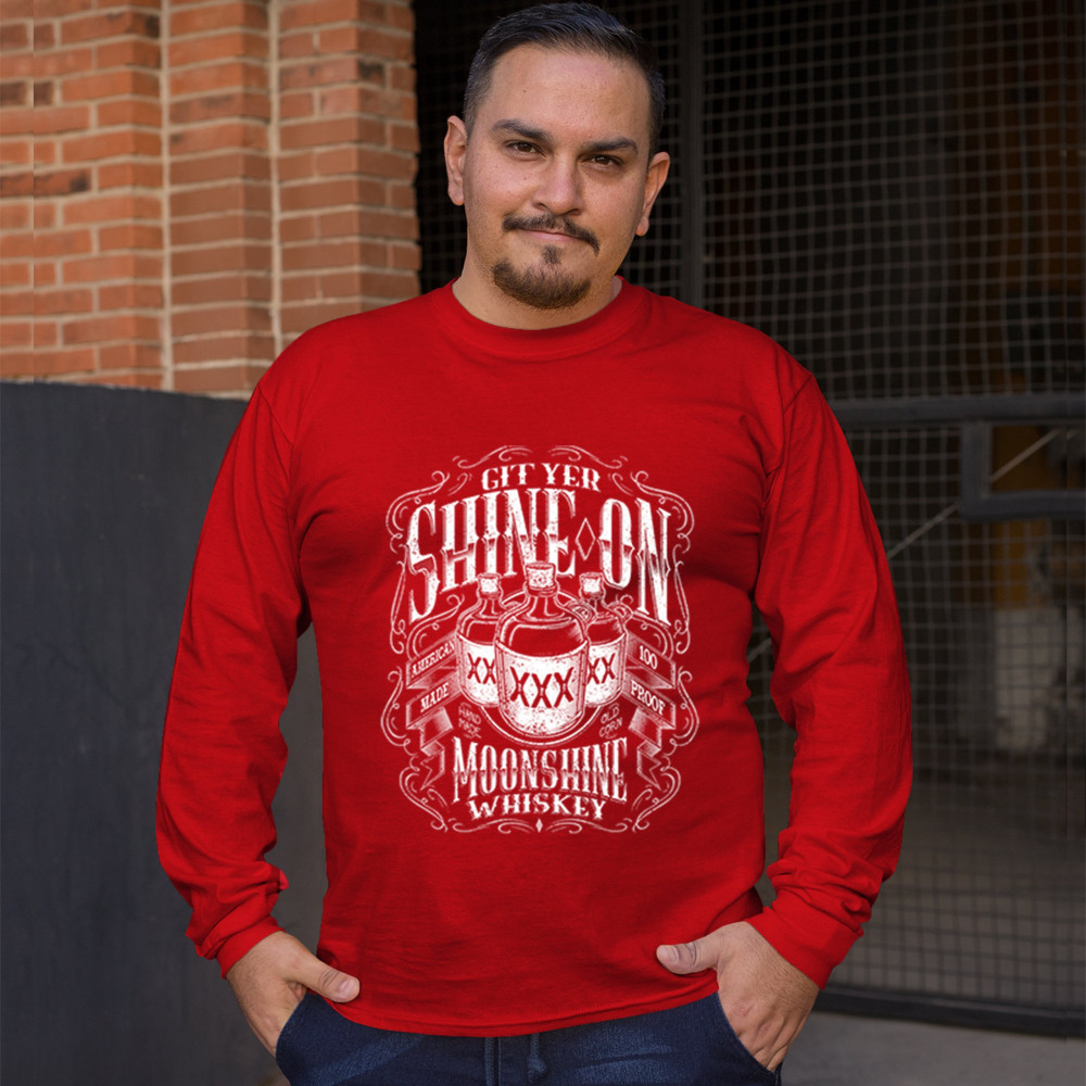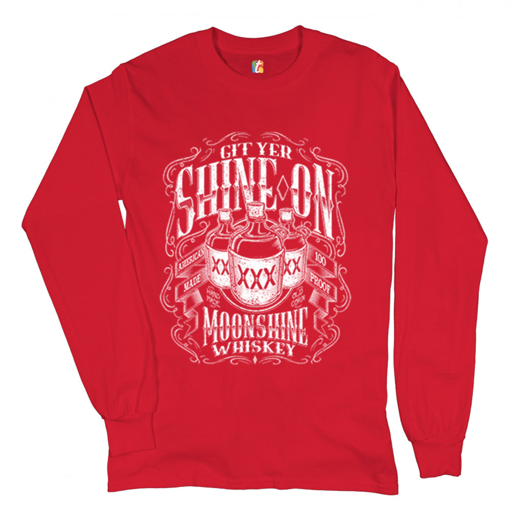 GIT YER SHINE ON MOONSHINE WHISKEY long sleeve t-shirt xxx mason jars drinking red