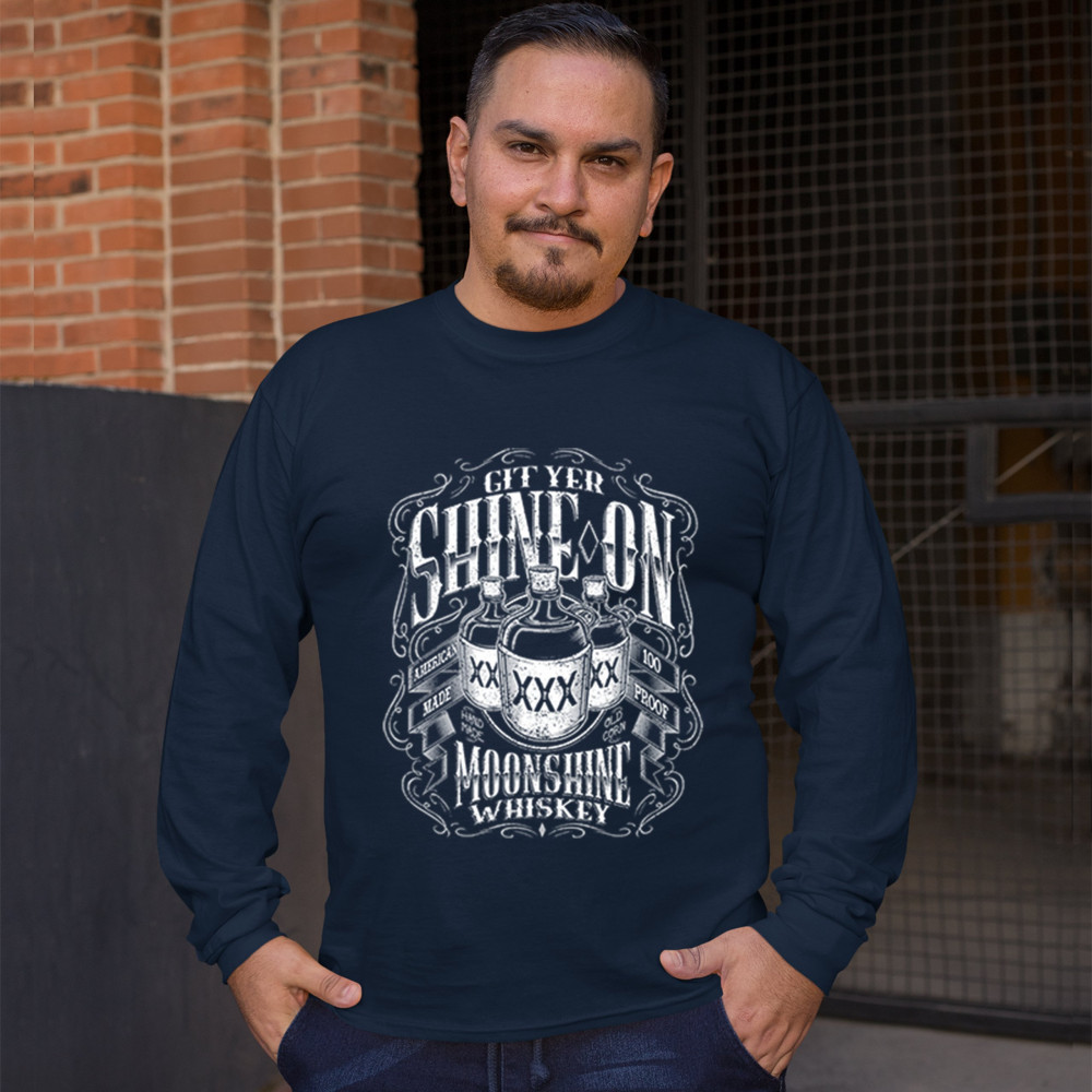 GIT YER SHINE ON MOONSHINE WHISKEY long sleeve t-shirt xxx mason jars drinking navy blue