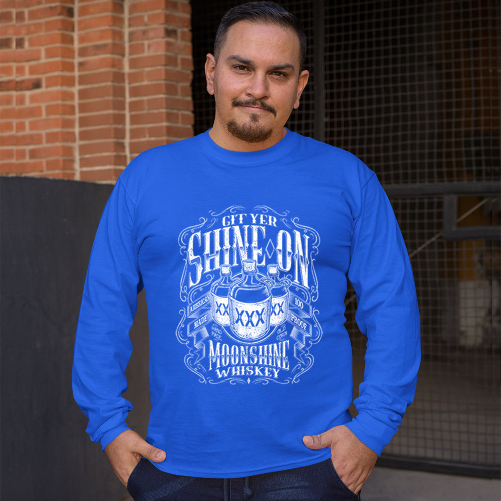 GIT YER SHINE ON MOONSHINE WHISKEY long sleeve t-shirt xxx mason jars drinking royal blue