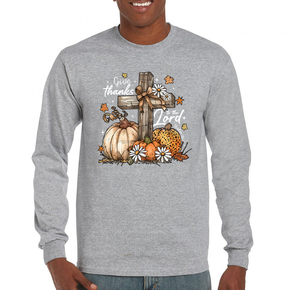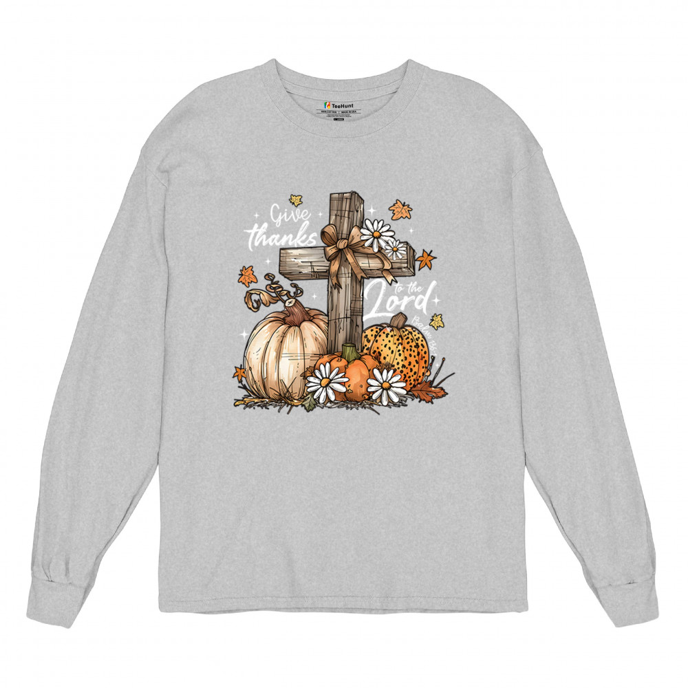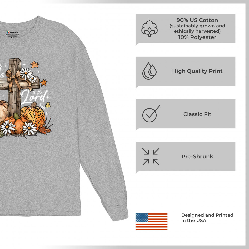 Thanksgiving design with pumpkins, daisies, and rustic cross. Perfect for Turkey Day, faithful family gatherings, and fall festival blessings.