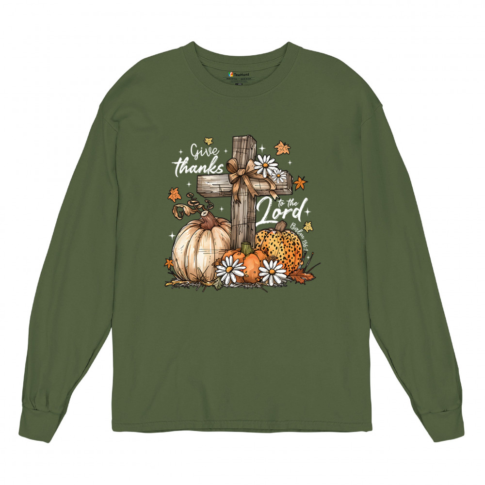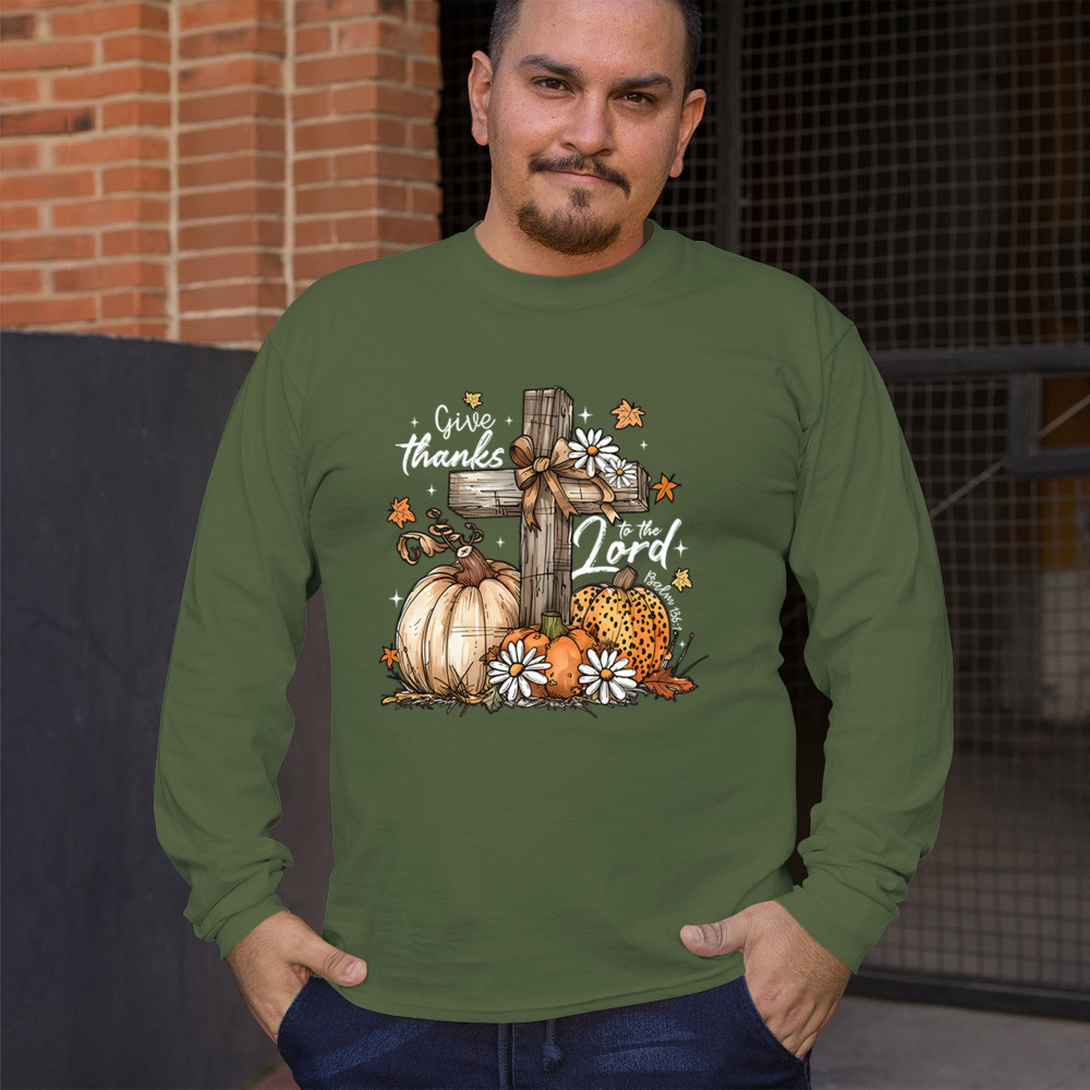 Thanksgiving design with pumpkins, daisies, and rustic cross. Perfect for Turkey Day, faithful family gatherings, and fall festival blessings.
