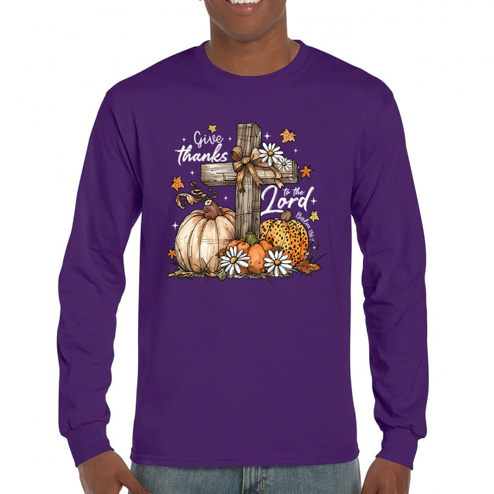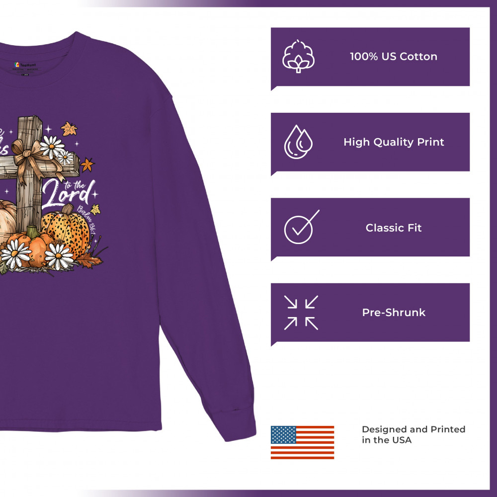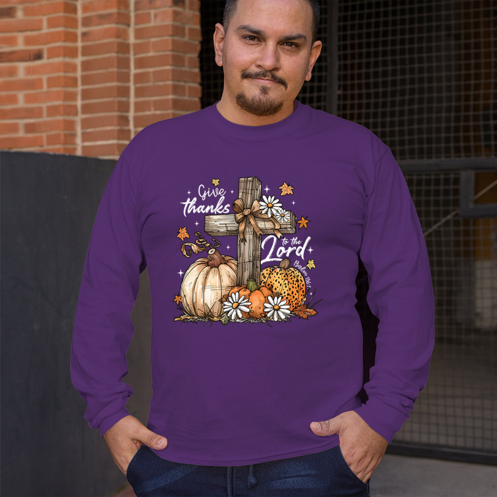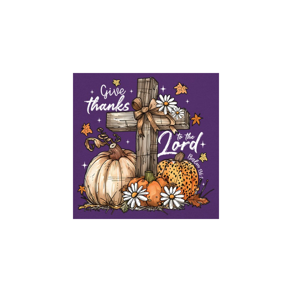 Thanksgiving design with pumpkins, daisies, and rustic cross. Perfect for Turkey Day, faithful family gatherings, and fall festival blessings.