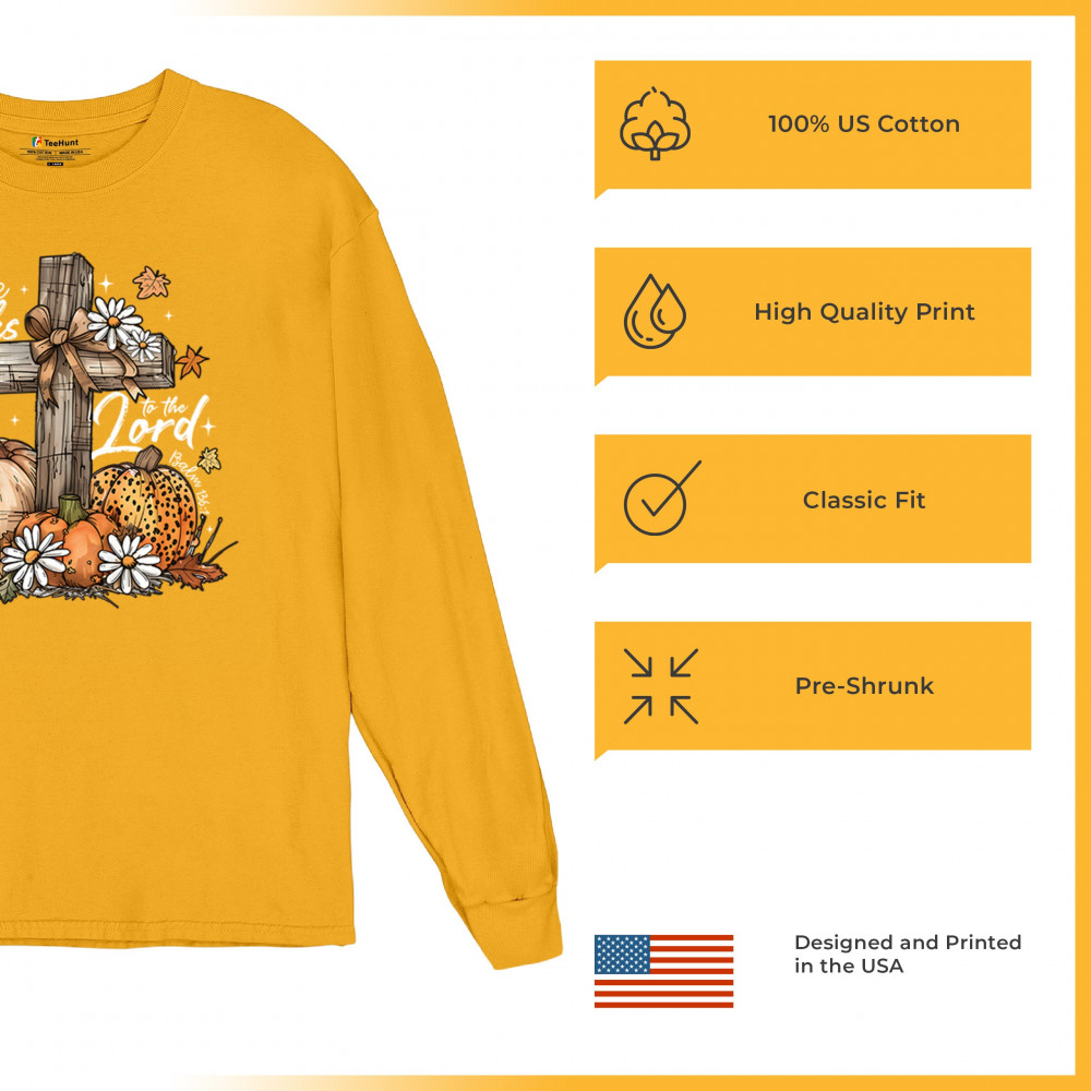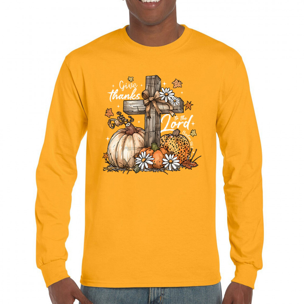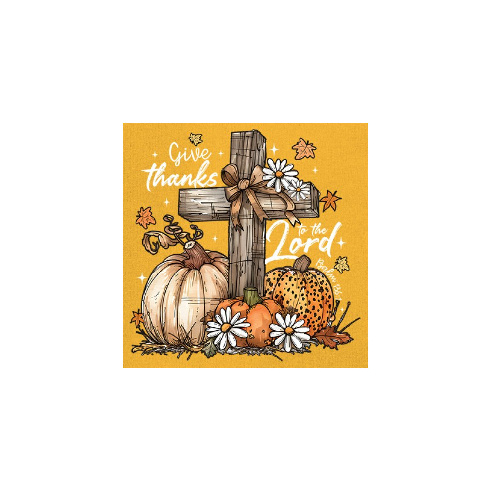 Thanksgiving design with pumpkins, daisies, and rustic cross. Perfect for Turkey Day, faithful family gatherings, and fall festival blessings.
