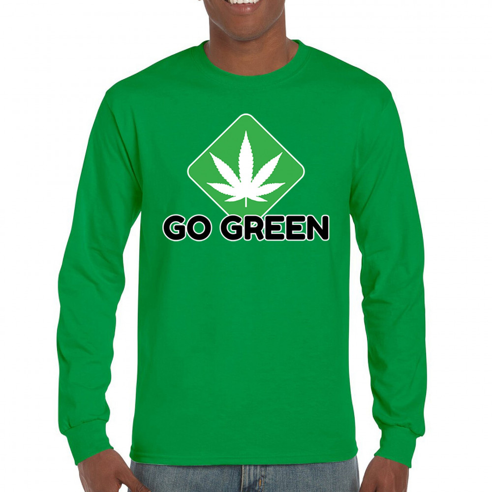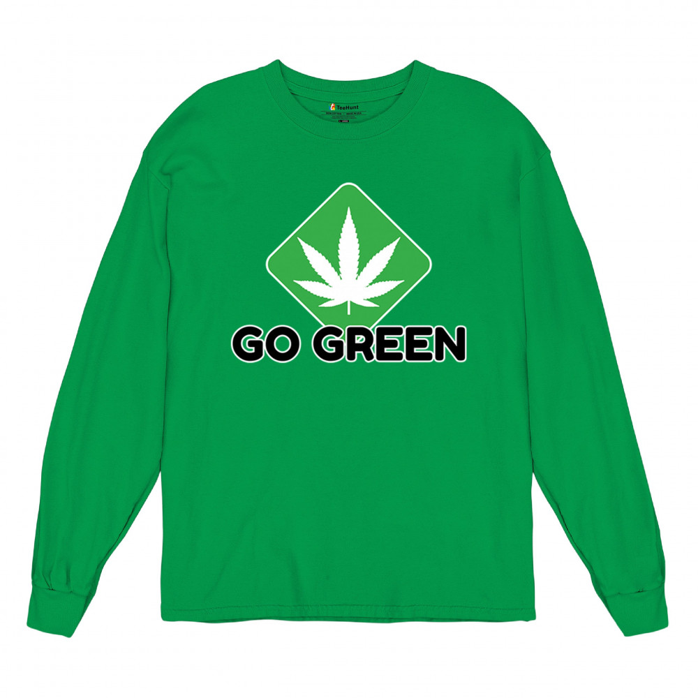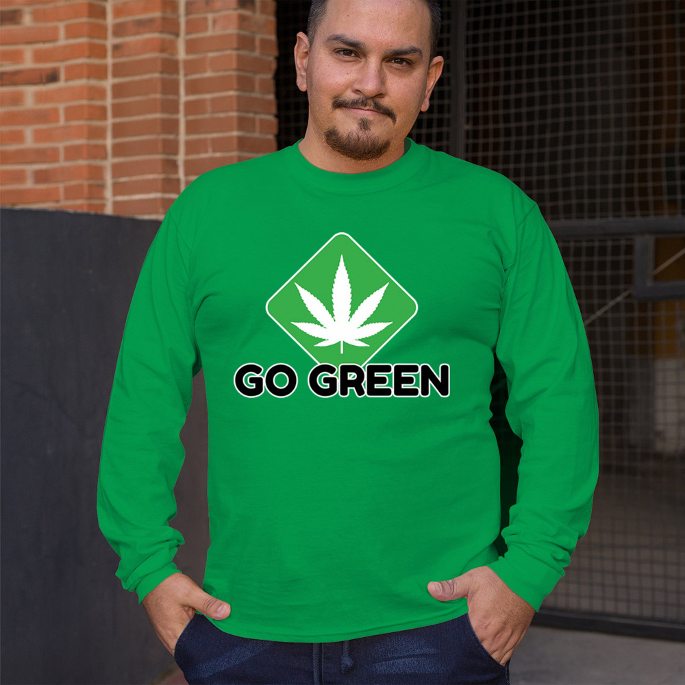 Bold Go Green design with cannabis leaf icon. Perfect for 420 fans, eco-conscious wearers, stoners, and marijuana advocates.