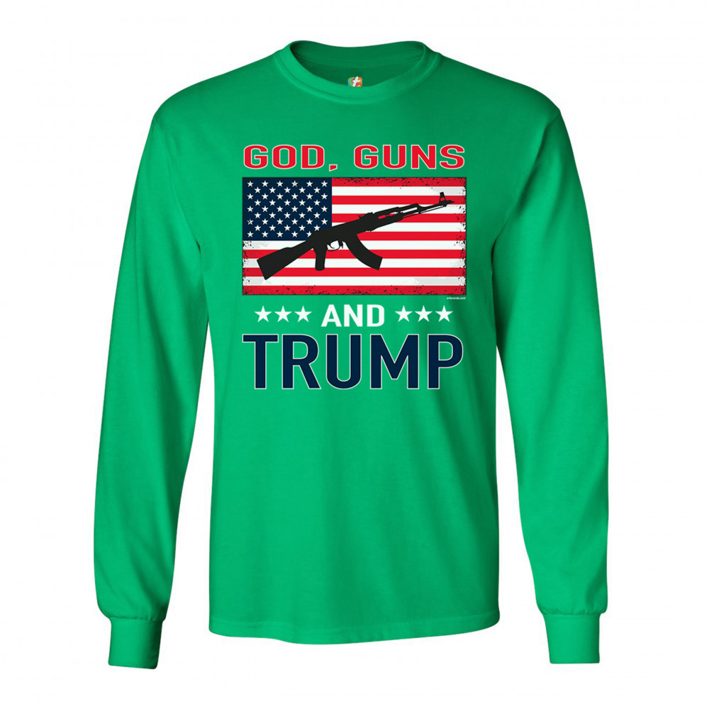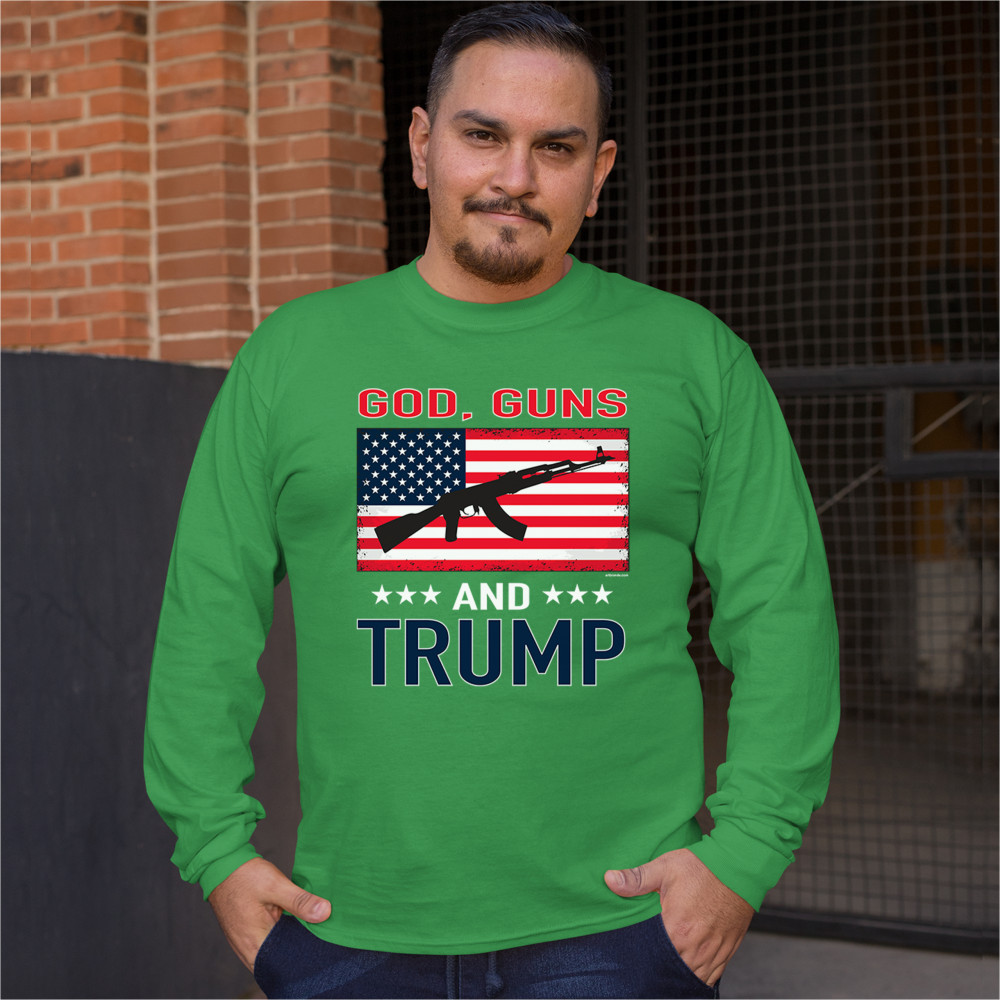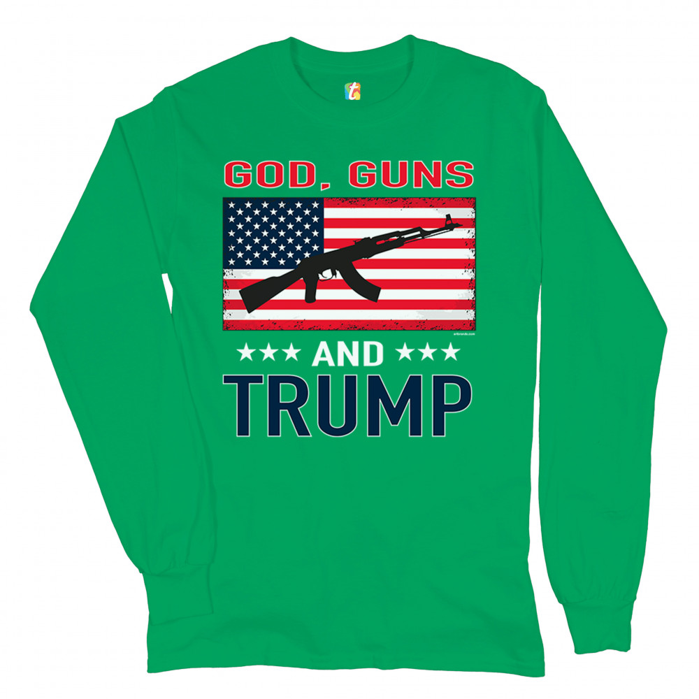 A political print saying "God, Guns and Trump". In the center there is the American flag with a silhouette of AK-47 rifle on it. A great choice to wear for a Trump rally or give as a gift to a Donald Trump and Mike Pence supporter before 2020 presidential elections.