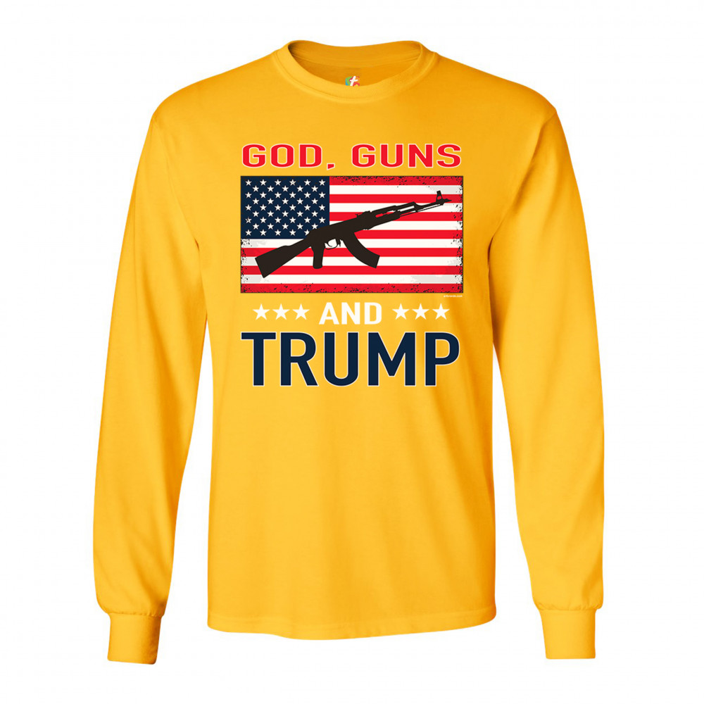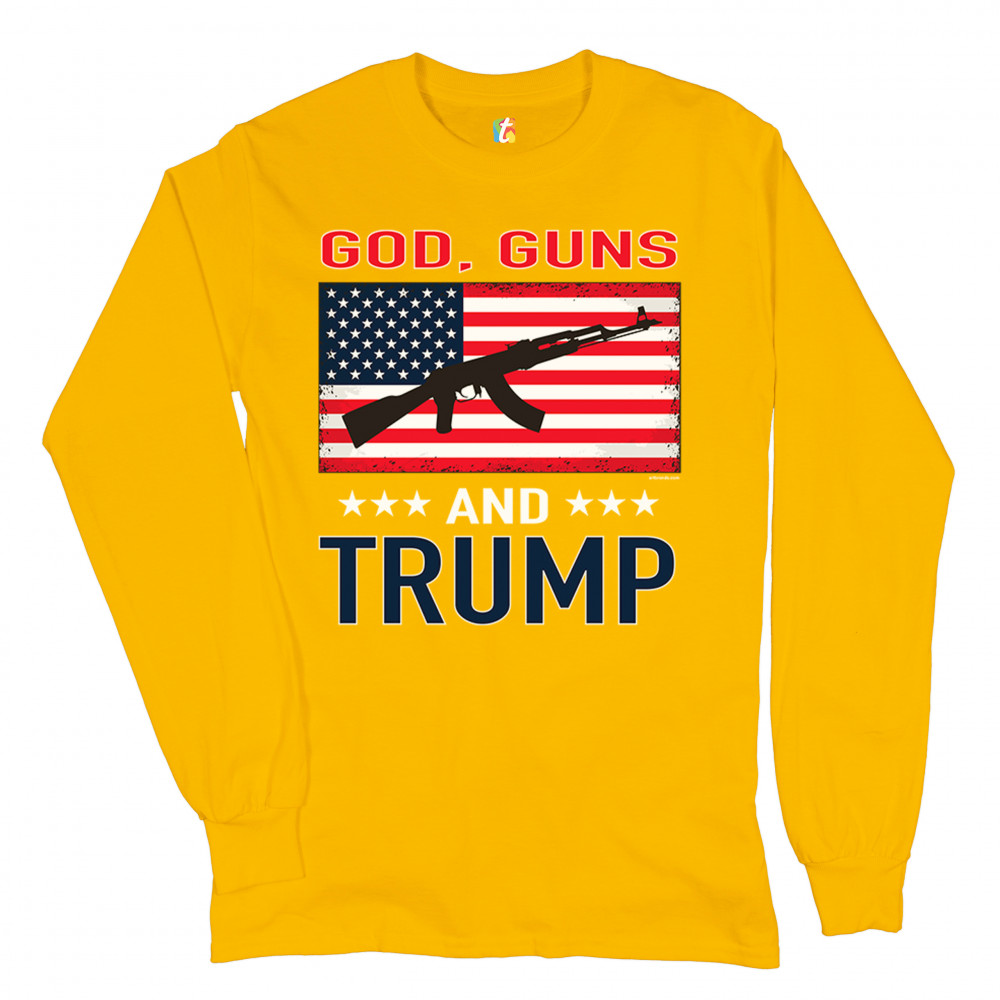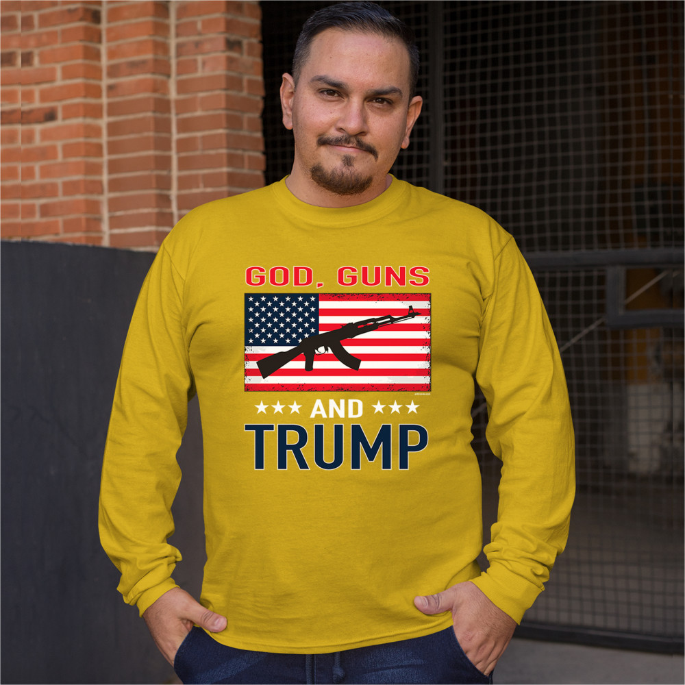 A political print saying "God, Guns and Trump". In the center there is the American flag with a silhouette of AK-47 rifle on it. A great choice to wear for a Trump rally or give as a gift to a Donald Trump and Mike Pence supporter before 2020 presidential elections.