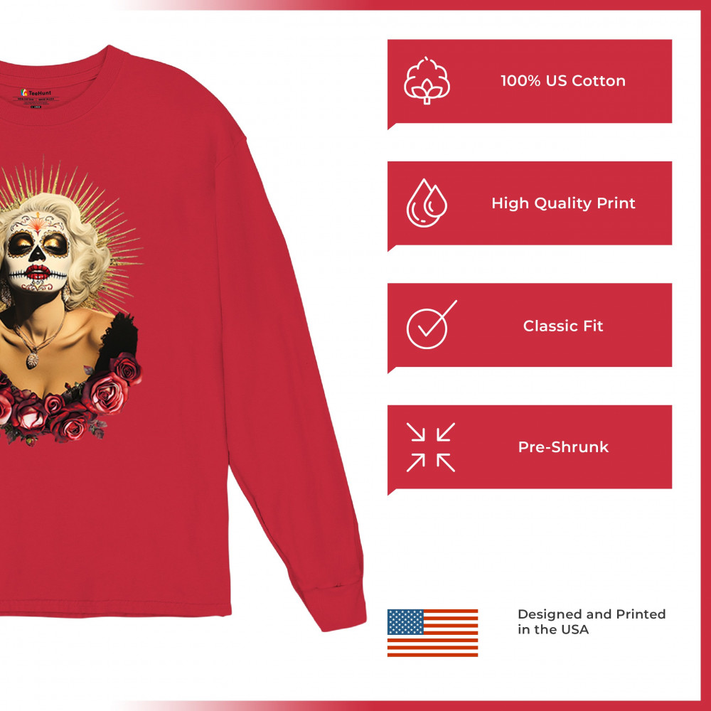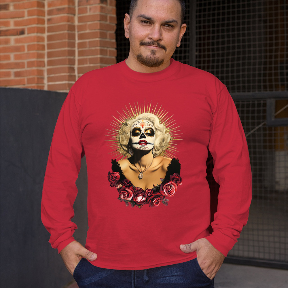 This bold and beautiful sugar skull design features a glamorous calavera woman crowned in a golden halo and framed by roses. A divine tribute to Dia de los Muertos, this look blends vintage glam, Latin culture, makeup artistry, and sacred symbolism. Perfect for fans of gothic beauty, Halloween, and heritage expression.